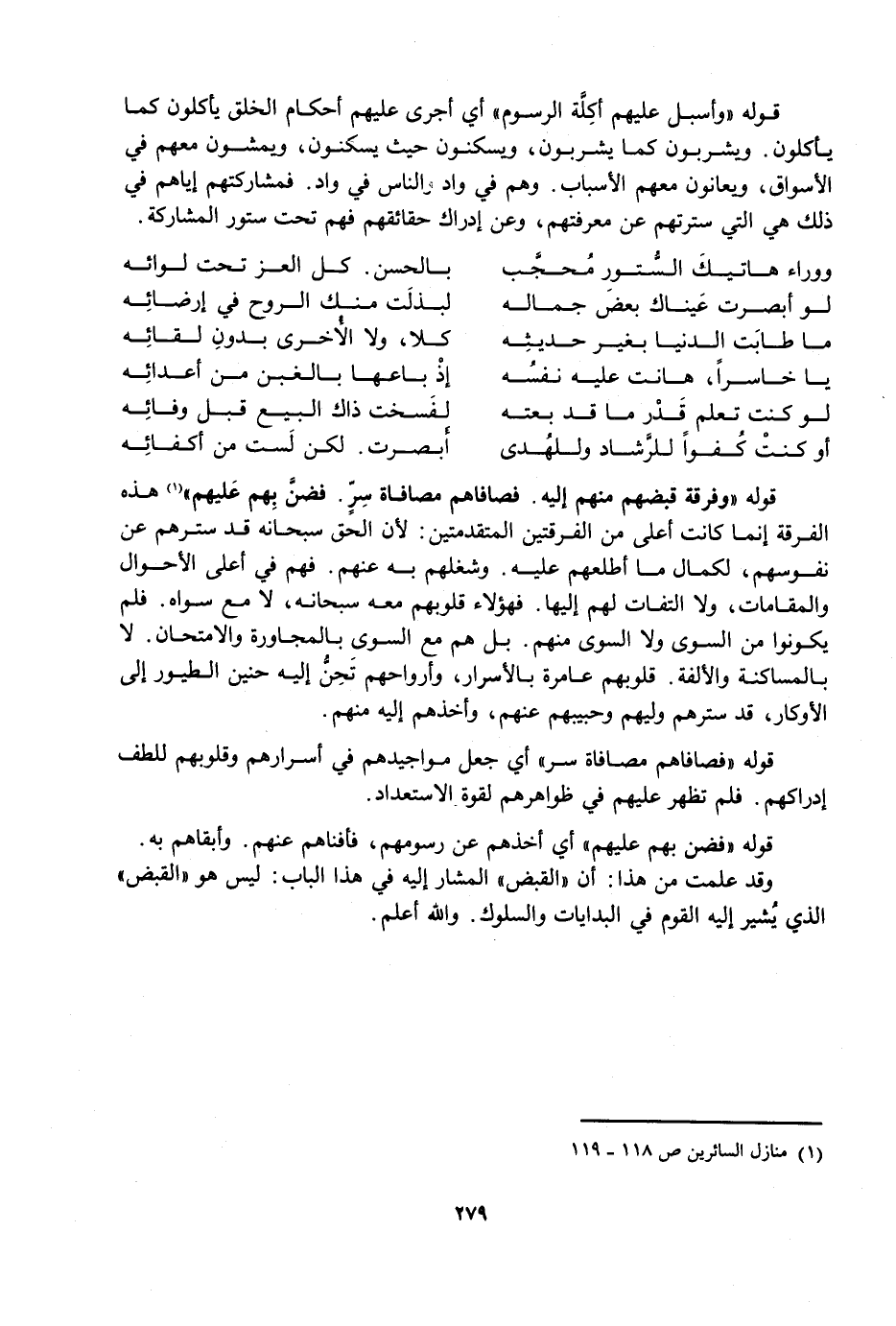 قَوْلُهُ: وَفِرْقَةٌ قَبْضُهُمْ مِنْهُمْ إِلَيْهِ، فَصَافَاهُمْ مُصَافَاةَ سِرٍّ، فَضَنَّ بِهِمْ عَلَيْهِمْ. هَذِهِ الْفِرْقَةُ إِنَّمَا كَانَتْ أَعْلَى مِنَ الْفِرْقَتَيْنِ الْمُتَقَدِّمَتَيْنِ: لِأَنَّ الْحَقَّ سُبْحَانَهُ قَدْ سَتَرَهُمْ عَنْ نُفُوسِهِمْ، لِكَمَالِ مَا أَطْلَعَهُمْ عَلَيْهِ، وَشَغَلَهُمْ بِهِ عَنْهُمْ، فَهُمْ فِي أَعْلَى الْأَحْوَالِ وَالْمَقَامَاتِ، وَلَا الْتِفَاتَ لَهُمْ إِلَيْهَا، فَهَؤُلَاءِ قُلُوبُهُمْ مَعَهُ سُبْحَانَهُ لَا مَعَ سِوَاهُ، فَلَمْ يَكُونُوا مَعَ السِّوَى وَلَا السِّوَى مِنْهُمْ، بَلْ هُمْ مَعَ السِّوَى بِالْمُجَاوَرَةِ وَالِامْتِحَانِ، لَا بِالْمُسَاكَنَةِ وَالْأُلْفَةِ، قُلُوبُهُمْ عَامِرَةٌ بِالْأَسْرَارِ، وَأَرْوَاحُهُمْ تَحِنُّ إِلَيْهِ حَنِينَ الطُّيُورِ إِلَى الْأَوْكَارِ، قَدْ سَتَرَهُمْ وَلِيُّهُمْ وَحَبِيبُهُمْ عَنْهُمْ، وَأَخَذَهُمْ إِلَيْهِ مِنْهُمْ.