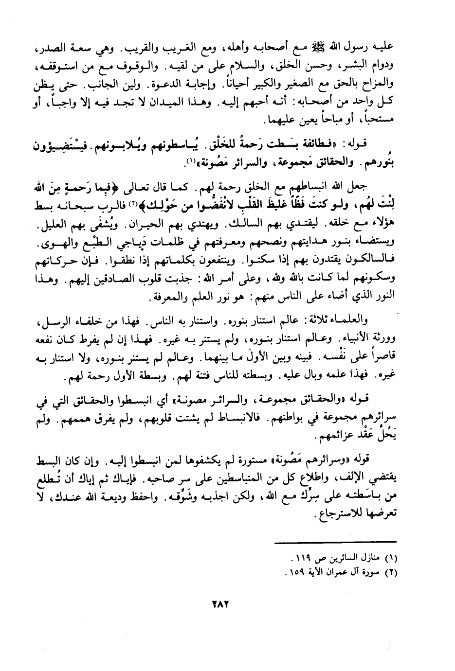 جَعَلَ اللَّهُ انْبِسَاطَهُمْ مَعَ الْخَلْقِ رَحْمَةً لَهُمْ، كَمَا قَالَ تَعَالَى: {فَبِمَا رَحْمَةٍ مِنَ اللَّهِ لِنْتَ لَهُمْ وَلَوْ كُنْتَ فَظًّا غَلِيظَ الْقَلْبِ لَانْفَضُّوا مِنْ حَوْلِكَ} [آل عمران: 159] فَالرَّبُّ سُبْحَانَهُ بَسَطَ هَؤُلَاءِ مَعَ خَلْقِهِ؛ لِيَقْتَدِيَ بِهِمُ السَّالِكُ، وَيَهْتَدِيَ بِهِمُ الْحَيْرَانُ، وَيُشْفَى بِهِمُ الْعَلِيلُ، وَيُسْتَضَاءَ بِنُورِ هِدَايَتِهِمْ وَنُصْحِهِمْ وَمَعْرِفَتِهِمْ فِي ظُلُمَاتِ دَيَاجِي الطَّبْعِ وَالْهَوَى، فَالسَّالِكُونَ يَقْتَدُونَ بِهِمْ إِذَا سَكَتُوا، وَيَنْتَفِعُونَ بِكَلِمَاتِهِمْ إِذَا نَطَقُوا، فَإِنَّ حَرَكَاتِهُمْ وَسُكُونَهُمْ لَمَّا كَانَتْ بِاللَّهِ وَلِلَّهِ وَعَلَى أَمْرِ اللَّهِ جَذَبَتْ قُلُوبَ الصَّادِقِينَ إِلَيْهِمْ، وَهَذَا النُّورُ الَّذِي أَضَاءَ عَلَى النَّاسِ مِنْهُمْ هُوَ نُورُ الْعِلْمِ وَالْمَعْرِفَةِ.