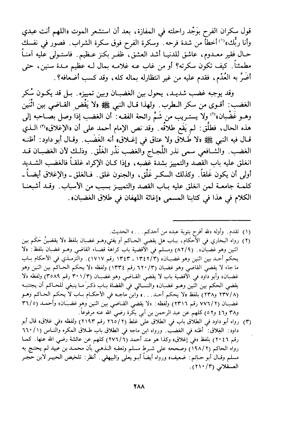 وَقَدْ يُوجِبُهُ غَضَبٌ شَدِيدٌ، يَحُولُ بَيْنَ الْغَضْبَانِ وَبَيْنَ تَمْيِيزِهِ، بَلْ قَدْ يَكُونُ سُكْرُ الْغَضَبِ أَقْوَى مِنْ سُكْرِ الطَّرَبِ، وَلِهَذَا قَالَ النَّبِيُّ صَلَّى اللَّهُ عَلَيْهِ وَسَلَّمَ «لَا يَقْضِ الْقَاضِي بَيْنَ اثْنَيْنِ وَهُوَ غَضْبَانُ» وَلَا يَسْتَرِيبُ مَنْ شَمَّ رَائِحَةَ الْفِقْهِ أَنَّ الْغَضَبَ إِذَا وَصَلَ بِصَاحِبِهِ إِلَى هَذِهِ الْحَالِ، فَطَلَّقَ لَمْ يَقَعْ طَلَاقُهُ، وَقَدْ نَصَّ الْإِمَامُ أَحْمَدُ عَلَى أَنَّ الْإِغْلَاقَ الَّذِي قَالَ فِيهِ النَّبِيُّ صَلَّى اللَّهُ عَلَيْهِ وَسَلَّمَ «لَا طَلَاقَ وَلَا عَتَاقَ فِي إِغْلَاقٍ» أَنَّهُ الْغَضَبُ، وَقَالَ أَبُو دَاوُدَ: أَظُنُّهُ الْغَضَبَ، وَالشَّافِعِيُّ سَمَّى نَذْرَ اللَّجَاجِ وَالْغَضَبِ نَذْرَ الْغَلْقِ؛ وَذَلِكَ لِأَنَّ الْغَضْبَانَ قَدِ انْغَلَقَ عَلَيْهِ بَابُ الْقَصْدِ وَالتَّمْيِيزِ بِشِدَّةِ غَضَبِهِ، وَإِذَا كَانَ الْإِكْرَاهُ غَلْقًا فَالْغَضَبُ الشَّدِيدُ أَوْلَى أَنْ يَكُونَ غَلْقًا، وَكَذَلِكَ السُّكْرُ غَلْقٌ، وَالْجُنُونُ غَلْقٌ. فَالْغَلْقُ وَالْإِغْلَاقُ أَيْضًا كَلِمَةٌ جَامِعَةٌ لِمَنِ انْغَلَقَ عَلَيْهِ بَابُ الْقَصْدِ وَالتَّمْيِيزِ بِسَبَبٍ مِنَ الْأَسْبَابِ. وَقَدْ أَشْبَعْنَا الْكَلَامَ فِي هَذَا فِي كِتَابِنَا الْمُسَمَّى إِغَاثَةَ اللَّهْفَانِ فِي طَلَاقِ الْغَضْبَانِ.
