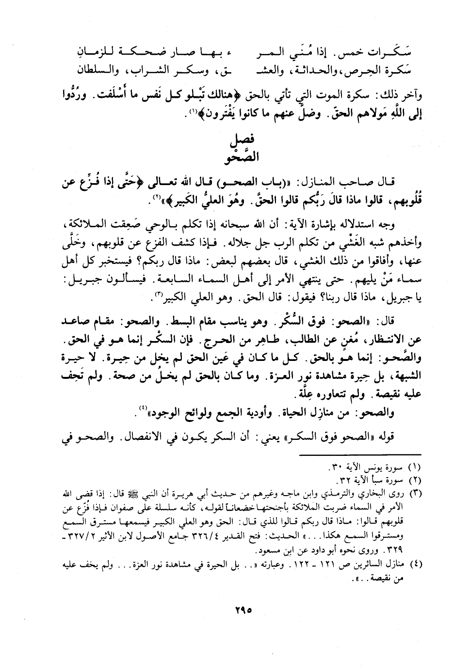 قَالَ صَاحِبُ الْمَنَازِلِ: (بَابُ الصَّحْوِ) قَالَ اللَّهُ تَعَالَى: {حَتَّى إِذَا فُزِّعَ عَنْ قُلُوبِهِمْ قَالُوا مَاذَا قَالَ رَبُّكُمْ قَالُوا الْحَقَّ وَهُوَ الْعَلِيُّ الْكَبِيرُ} [سبأ: 23] .