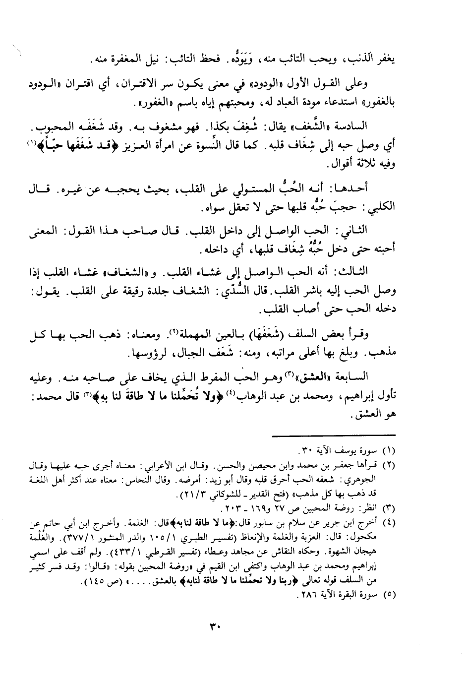 السَّابِعَةُ: الْعِشْقُ وَهُوَ الْحُبُّ الْمُفْرِطُ الَّذِي يُخَافُ عَلَى صَاحِبِهِ مِنْهُ. وَعَلَيْهِ تَأَوَّلَ إِبْرَاهِيمُ، وَمُحَمَّدُ بْنُ عَبْدِ الْوَهَّابِ {وَلَا تُحَمِّلْنَا مَا لَا طَاقَةَ لَنَا بِهِ} [البقرة: 286] قَالَ مُحَمَّدٌ: هُوَ الْعِشْقُ.