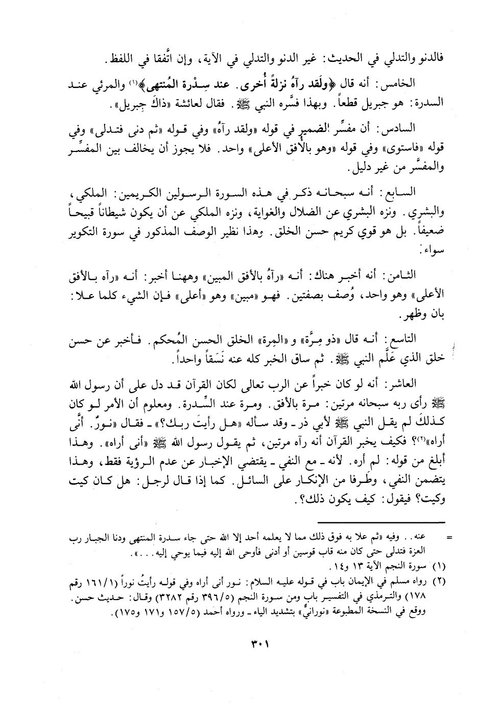 الْخَامِسُ: أَنَّهُ قَالَ: {وَلَقَدْ رَآهُ نَزْلَةً أُخْرَى - عِنْدَ سِدْرَةِ الْمُنْتَهَى} [النجم: 13 - 14] وَالْمَرْئِيُّ عِنْدَ السِّدْرَةِ: هُوَ جِبْرِيلُ قَطْعًا، وَبِهَذَا فَسَّرَهُ النَّبِيُّ صَلَّى اللَّهُ عَلَيْهِ وَسَلَّمَ، فَقَالَ لِعَائِشَةَ «ذَاكَ جِبْرِيلُ» .
