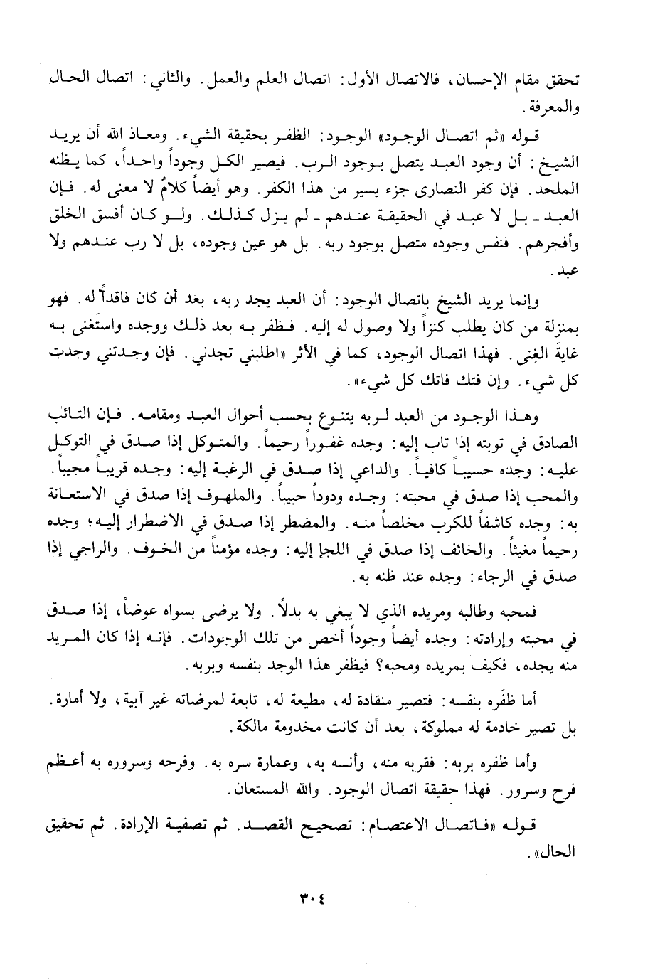قَوْلُهُ: " ثُمَّ اتِّصَالُ الْوُجُودِ " الْوُجُودُ: الظَّفَرُ بِحَقِيقَةِ الشَّيْءِ، وَمَعَاذَ اللَّهِ أَنْ يُرِيدَ الشَّيْخُ: أَنَّ وُجُودَ الْعَبْدِ يَتَّصِلُ بِوُجُودِ الرَّبِّ، فَيَصِيرُ الْكُلُّ وُجُودًا وَاحِدًا، كَمَا يَظُنُّهُ الْمُلْحِدُ، فَإِنَّ كُفْرَ النَّصَارَى جُزْءٌ يَسِيرُ مِنْ هَذَا الْكُفْرِ، وَهُوَ أَيْضًا كَلَامٌ لَا مَعْنَى لَهُ، فَإِنَّ الْعَبْدَ بَلْ لَا عَبْدَ فِي الْحَقِيقَةِ عِنْدَهُمْ لَمْ يَزَلْ كَذَلِكَ، وَلَوْ كَانَ أَفْسَدَ الْخَلْقِ وَأَفْجَرَهُمْ، فَنَفْسُ وُجُودِهِ مُتَّصِلٌ بِوُجُودِ رَبِّهِ، بَلْ هُوَ عَيْنُ وُجُودِهِ، بَلْ لَا رَبَّ عِنْدَهُمْ وَلَا عَبْدَ.