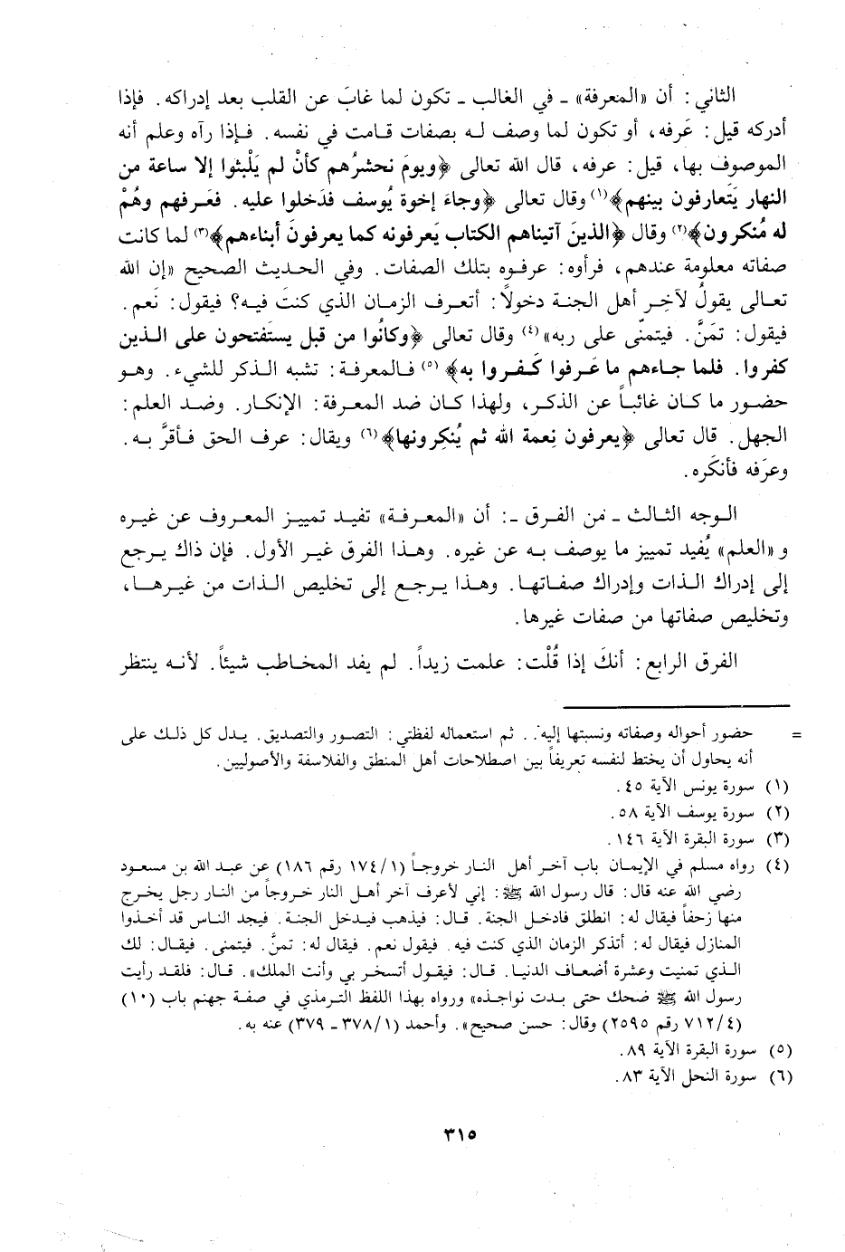 الثَّانِي: أَنَّ الْمَعْرِفَةَ فِي الْغَالِبِ تَكُونُ لِمَا غَابَ عَنِ الْقَلْبِ بَعْدَ إِدْرَاكِهِ، فَإِذَا أَدْرَكَهُ قِيلَ: عَرَفَهُ، أَوْ تَكُونُ لِمَا وُصِفَ لَهُ بِصِفَاتٍ قَامَتْ فِي نَفْسِهِ، فَإِذَا رَآهُ وَعَلِمَ أَنَّهُ الْمَوْصُوفُ بِهَا، قِيلَ: عَرَفَهُ، قَالَ اللَّهُ تَعَالَى: {وَيَوْمَ يَحْشُرُهُمْ كَأَنْ لَمْ يَلْبَثُوا إِلَّا سَاعَةً مِنَ النَّهَارِ يَتَعَارَفُونَ بَيْنَهُمْ} [يونس: 45] ، وَقَالَ تَعَالَى: {وَجَاءَ إِخْوَةُ يُوسُفَ فَدَخَلُوا عَلَيْهِ فَعَرَفَهُمْ وَهُمْ لَهُ مُنْكِرُونَ} [يوسف: 58] ، وَقَالَ: {الَّذِينَ آتَيْنَاهُمُ الْكِتَابَ يَعْرِفُونَهُ كَمَا يَعْرِفُونَ أَبْنَاءَهُمْ} [البقرة: 146] لَمَّا كَانَتْ صِفَاتُهُ مَعْلُومَةً عِنْدَهُمْ، فَرَأَوْهُ: عَرَفُوهُ بِتِلْكَ الصِّفَاتِ، وَفِي الْحَدِيثِ الصَّحِيحِ: «إِنَّ اللَّهَ تَعَالَى يَقُولُ لِآخِرِ أَهْلِ الْجَنَّةِ دُخُولًا: أَتَعْرِفُ الزَّمَانَ الَّذِي كُنْتَ فِيهِ؟ فَيَقُولُ: نَعَمْ. فَيَقُولُ: تَمَنَّ، فَيَتَمَنَّى عَلَى رَبِّهِ» وَقَالَ تَعَالَى: {وَكَانُوا مِنْ قَبْلُ يَسْتَفْتِحُونَ عَلَى الَّذِينَ كَفَرُوا فَلَمَّا جَاءَهُمْ مَا عَرَفُوا كَفَرُوا بِهِ} [البقرة: 89] فَالْمَعْرِفَةُ: تُشْبِهُ الذِّكْرَ لِلشَّيْءِ، وَهُوَ حُضُورُ مَا كَانَ غَائِبًا عَنِ الذِّكْرِ، وَلِهَذَا كَانَ ضِدَّ الْمَعْرِفَةِ الْإِنْكَارُ، وَضِدَّ الْعِلْمِ الْجَهْلُ، قَالَ تَعَالَى: {يَعْرِفُونَ نِعْمَةَ اللَّهِ ثُمَّ يُنْكِرُونَهَا} [النحل: 83] وَيُقَالُ: عَرَفَ الْحَقَّ فَأَقَرَّ بِهِ، وَعَرَفَهُ فَأَنْكَرَهُ.