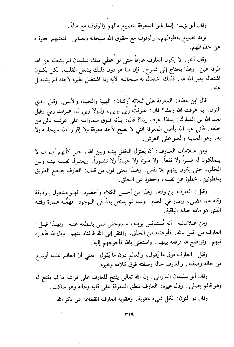 قَالَ ابْنُ عَطَاءٍ: الْمَعْرِفَةُ عَلَى ثَلَاثَةِ أَرْكَانٍ: الْهَيْبَةُ وَالْحَيَاءُ وَالْأُنْسُ. وَقِيلَ لِذِي النُّونِ: بِمَ عَرَفْتَ اللَّهَ رَبَّكَ؟ قَالَ: عَرَفْتُ رَبِّي بِرَبِّي، وَلَوْلَا رَبِّي لَمَا عَرَفْتُ رَبِّي. وَقِيلَ لِعَبْدِ اللَّهِ بْنِ الْمُبَارَكِ: بِمَاذَا نَعْرِفُ رَبَّنَا؟ قَالَ: بِأَنَّهُ فَوْقَ سَمَاوَاتِهِ عَلَى عَرْشِهِ بَائِنٌ مِنْ خَلْقِهِ، فَأَتَى عَبْدُ اللَّهِ بِأَصْلِ الْمَعْرِفَةِ الَّتِي لَا يَصِحُّ لِأَحَدٍ مَعْرِفَةٌ وَلَا إِقْرَارٌ بِاللَّهِ سُبْحَانَهُ إِلَّا بِهِ، وَهُوَ الْمُبَايَنَةُ وَالْعُلُوُّ عَلَى الْعَرْشِ.
