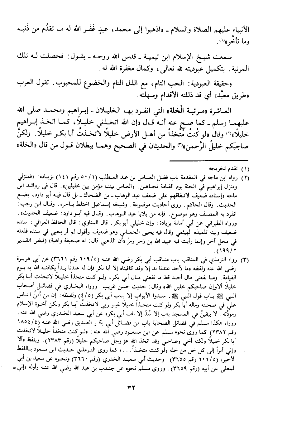الْعَاشِرَةُ: مَرْتَبَةُ الْخُلَّةِ الَّتِي انْفَرَدَ بِهَا الْخَلِيلَانِ - إِبْرَاهِيمُ وَمُحَمَّدٌ صَلَّى اللَّهُ عَلَيْهِمَا وَسَلَّمَ - كَمَا صَحَّ عَنْهُ أَنَّهُ قَالَ: «إِنَّ اللَّهَ اتَّخَذَنِي خَلِيلًا، كَمَا اتَّخَذَ إِبْرَاهِيمَ خَلِيلًا» .