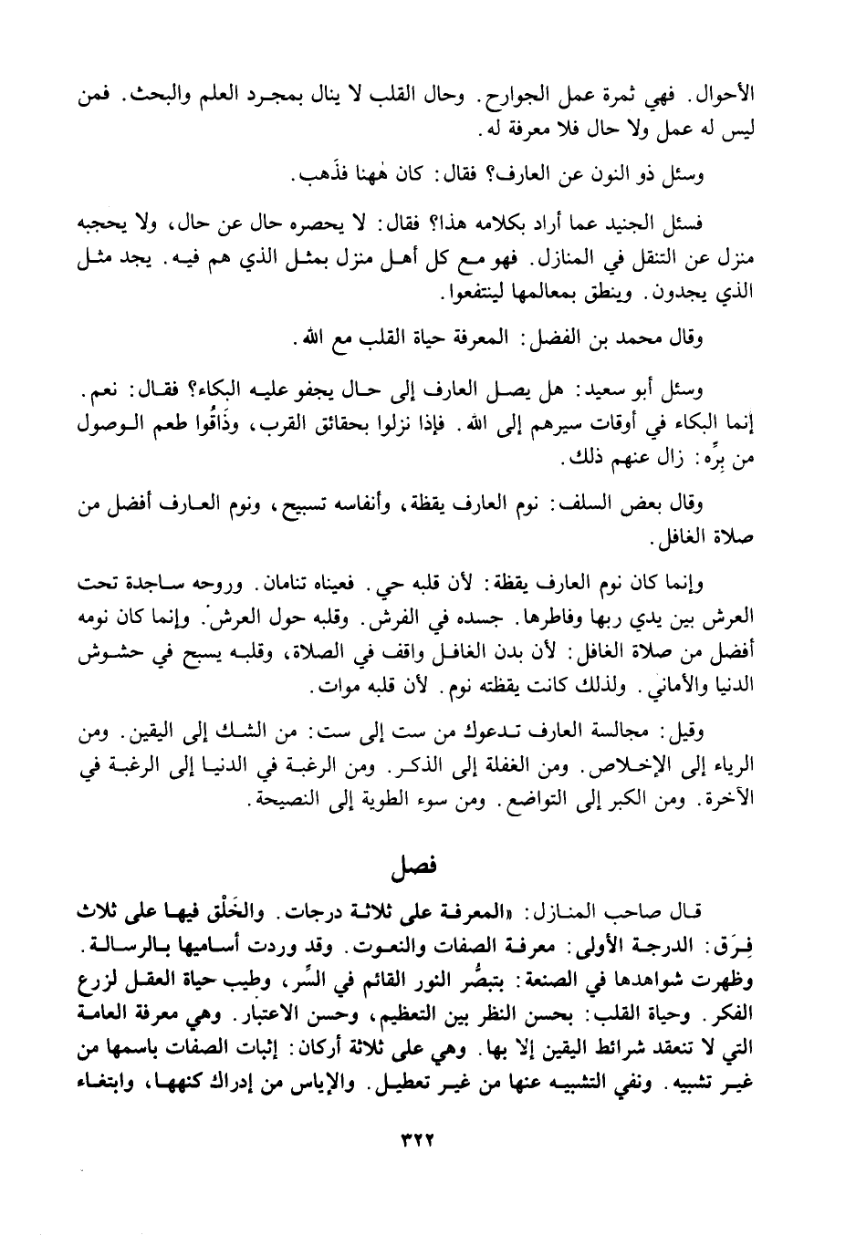 قَالَ صَاحِبُ الْمَنَازِلِ: الْمَعْرِفَةُ عَلَى ثَلَاثِ دَرَجَاتٍ، وَالْخَلْقُ فِيهَا عَلَى ثَلَاثِ فِرَقٍ: الدَّرَجَةُ الْأُولَى: مَعْرِفَةُ الصِّفَاتِ وَالنُّعُوتِ، وَقَدْ وَرَدَتْ أَسَامِيهَا بِالرِّسَالَةِ، وَظَهَرَتْ شَوَاهِدُهَا فِي الصَّنْعَةِ: بِتَبَصُّرِ النُّورِ الْقَائِمِ فِي السِّرِّ، وَطِيبِ حَيَاةِ الْعَقْلِ لِزَرْعِ الْفِكْرِ، وَحَيَاةُ الْقَلْبِ: بِحُسْنِ النَّظَرِ بَيْنَ التَّعْظِيمِ، وَحُسْنِ الِاعْتِبَارِ، وَهِيَ مَعْرِفَةُ الْعَامَّةِ الَّتِي لَا تَنْعَقِدُ شَرَائِطُ الْيَقِينِ إِلَّا بِهَا، وَهِيَ عَلَى ثَلَاثَةِ أَرْكَانٍ: إِثْبَاتُ الصِّفَاتِ بِاسْمِهَا مِنْ غَيْرِ تَشْبِيهٍ، وَنَفْيُ التَّشْبِيهِ عَنْهَا مِنْ غَيْرِ تَعْطِيلٍ، وَالْإِيَاسُ مِنْ إِدْرَاكِ كُنْهِهَا، وَابْتِغَاءِ