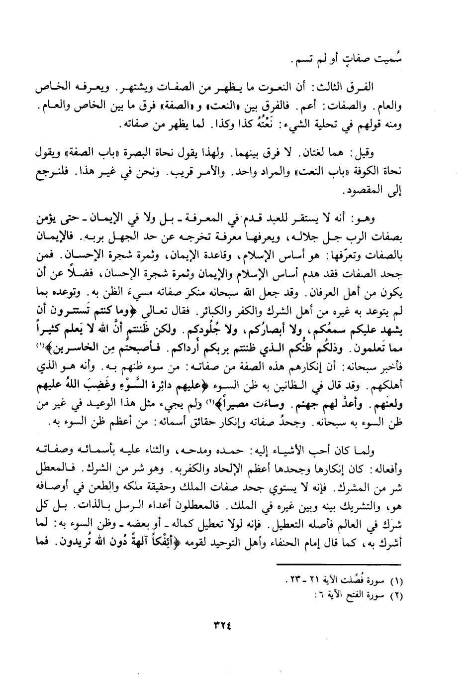 وَهُوَ: أَنَّهُ لَا يَسْتَقِرُّ لِلْعَبْدِ قَدَمٌ فِي الْمَعْرِفَةِ - بَلْ وَلَا فِي الْإِيمَانِ - حَتَّى يُؤْمِنَ بِصِفَاتِ الرَّبِّ جَلَّ جَلَالُهُ، وَيَعْرِفَهَا مَعْرِفَةً تُخْرِجُهُ عَنْ حَدِّ الْجَهْلِ بِرَبِّهِ، فَالْإِيمَانُ بِالصِّفَاتِ وَتَعَرُّفُهَا: هُوَ أَسَاسُ الْإِسْلَامِ، وَقَاعِدَةُ الْإِيمَانِ، وَثَمَرَةُ شَجَرَةِ الْإِحْسَانِ، فَمَنْ جَحَدَ الصِّفَاتِ فَقَدْ هَدَمَ أَسَاسَ الْإِسْلَامِ وَالْإِيمَانِ وَثَمَرَةَ شَجَرَةِ الْإِحْسَانِ، فَضْلًا عَنْ أَنْ يَكُونَ مِنْ أَهْلِ الْعِرْفَانِ، وَقَدْ جَعَلَ اللَّهُ سُبْحَانَهُ مُنْكِرَ صِفَاتِهِ مُسِيءَ الظَّنِّ بِهِ، وَتَوَعَّدَهُ بِمَا لَمْ يَتَوَعَّدْ بِهِ غَيْرَهُ مِنْ أَهْلِ الشِّرْكِ وَالْكُفْرِ وَالْكَبَائِرِ، فَقَالَ تَعَالَى {وَمَا كُنْتُمْ تَسْتَتِرُونَ أَنْ يَشْهَدَ عَلَيْكُمْ سَمْعُكُمْ وَلَا أَبْصَارُكُمْ وَلَا جُلُودُكُمْ وَلَكِنْ ظَنَنْتُمْ أَنَّ اللَّهَ لَا يَعْلَمُ كَثِيرًا مِمَّا تَعْمَلُونَ} [فصلت: 22] . {وَذَلِكُمْ ظَنُّكُمُ الَّذِي ظَنَنْتُمْ بِرَبِّكُمْ أَرْدَاكُمْ فَأَصْبَحْتُمْ مِنَ الْخَاسِرِينَ} [فصلت: 23] فَأَخْبَرَ سُبْحَانَهُ: أَنَّ إِنْكَارَهُمْ هَذِهِ الصِّفَةَ مِنْ صِفَاتِهِ: مِنْ سُوءِ ظَنِّهِمْ بِهِ، وَأَنَّهُ هُوَ الَّذِي أَهْلَكَهُمْ، وَقَدْ قَالَ فِي الظَّانِّينَ بِهِ ظَنَّ السَّوْءِ {عَلَيْهِمْ دَائِرَةُ السَّوْءِ وَغَضِبَ اللَّهُ عَلَيْهِمْ وَلَعَنَهُمْ وَأَعَدَّ لَهُمْ جَهَنَّمَ وَسَاءَتْ مَصِيرًا} [الفتح: 6] وَلَمْ يَجِئْ مِثْلُ هَذَا الْوَعِيدِ فِي غَيْرِ مَنْ ظَنَّ السَّوْءَ بِهِ سُبْحَانَهُ، وَجَحْدُ صِفَاتِهِ وَإِنْكَارُ حَقَائِقِ أَسْمَائِهِ مِنْ أَعْظَمِ ظَنِّ السَّوْءِ بِهِ.