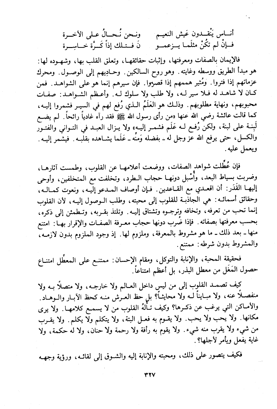 فَإِنْ عُطِّلَتْ شَوَاهِدُ الصِّفَاتِ، وَوُضِعَتْ أَعْلَامُهَا عَنِ الْقُلُوبِ، وَطُمِسَتْ آثَارُهَا، وَضُرِبَتْ بِسِيَاطِ الْبُعْدِ، وَأُسْبِلَ دُونَهَا حِجَابُ الطَّرْدِ، وَتَخَلَّفَتْ مَعَ الْمُتَخَلِّفِينَ، وَأَوْحَى إِلَيْهَا الْقَدَرُ: أَنِ اقْعُدِي مَعَ الْقَاعِدِينَ، فَإِنَّ أَوْصَافَ الْمَدْعُوِّ إِلَيْهِ، وَنُعُوتَ كَمَالِهِ، وَحَقَائِقَ أَسْمَائِهِ: هِيَ الْجَاذِبَةُ لِلْقُلُوبِ إِلَى مَحَبَّتِهِ، وَطَلَبِ الْوُصُولِ إِلَيْهِ؛ لِأَنَّ الْقُلُوبَ إِنَّمَا تُحِبُّ مَنْ تَعْرِفُهُ، وَتَخَافُهُ وَتَرْجُوهُ وَتَشْتَاقُ إِلَيْهِ، وَتَلْتَذُّ بِقُرْبِهِ، وَتَطْمَئِنُّ إِلَى ذِكْرِهِ، بِحَسَبِ مَعْرِفَتِهَا بِصِفَاتِهِ، فَإِذَا ضُرِبَ دُونَهَا حِجَابُ مَعْرِفَةِ الصِّفَاتِ وَالْإِقْرَارِ بِهَا: امْتَنَعَ مِنْهَا - بَعْدَ ذَلِكَ - مَا هُوَ مَشْرُوطٌ بِالْمَعْرِفَةِ، وَمَلْزُومٌ لَهَا، إِذْ وُجُودُ الْمَلْزُومِ بِدُونِ لَازِمِهِ، وَالْمَشْرُوطِ بِدُونِ شَرْطِهِ، مُمْتَنِعٌ.