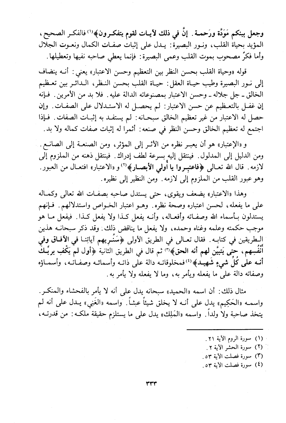 وَهَذَا الِاعْتِبَارُ يَضْعُفُ وَيَقْوَى، حَتَّى يَسْتَدِلَّ صَاحِبُهُ بِصِفَاتِ اللَّهِ تَعَالَى وَكَمَالِهِ عَلَى مَا يَفْعَلُهُ، لِحُسْنِ اعْتِبَارِهِ وَصِحَّةِ نَظَرِهِ، وَهُوَ اعْتِبَارُ الْخَوَاصِّ وَاسْتِدْلَالُهُمْ، فَإِنَّهُمْ يَسْتَدِلُّونَ بِأَسْمَاءِ اللَّهِ وَصِفَاتِهِ وَأَفْعَالِهِ، وَأَنَّهُ يَفْعَلُ كَذَا وَلَا يَفْعَلُ كَذَا، فَيَفْعَلُ مَا هُوَ مُوجَبُ حِكْمَتِهِ وَعِلْمِهِ وَغِنَاهُ وَحَمْدِهِ، وَلَا يَفْعَلُ مَا يُنَاقِضُ ذَلِكَ، وَقَدْ ذَكَرَ سُبْحَانَهُ هَذَيْنِ الطَّرِيقَيْنِ فِي كِتَابِهِ، فَقَالَ تَعَالَى فِي الطَّرِيقِ الْأُولَى {سَنُرِيهِمْ آيَاتِنَا فِي الْآفَاقِ وَفِي أَنْفُسِهِمْ حَتَّى يَتَبَيَّنَ لَهُمْ أَنَّهُ الْحَقُّ} [فصلت: 53] ثُمَّ قَالَ فِي الطَّرِيقِ الثَّانِيَةِ {أَوَلَمْ يَكْفِ بِرَبِّكَ أَنَّهُ عَلَى كُلِّ شَيْءٍ شَهِيدٌ} [فصلت: 53] فَمَخْلُوقَاتُهُ دَالَّةٌ عَلَى ذَاتِهِ وَأَسْمَائِهِ وَصِفَاتِهِ، وَأَسْمَاؤُهُ وَصِفَاتُهُ دَالَّةٌ عَلَى مَا يَفْعَلُهُ وَيَأْمُرُ بِهِ، وَمَا لَا يَفْعَلُهُ وَلَا يَأْمُرُ بِهِ.
