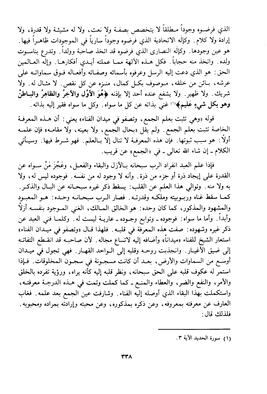 فَإِذَا عَلِمَ الْعَبْدُ انْفِرَادَ الرَّبِّ سُبْحَانَهُ بِالْأَزَلِ وَالْبَقَاءِ وَالْفِعْلِ، وَعَجَزَ مَنْ سِوَاهُ عَنِ الْقُدْرَةِ عَلَى إِيجَادِ ذَرَّةٍ أَوْ جُزْءٍ مِنْ ذَرَّةٍ، وَأَنَّهُ لَا وُجُودَ لَهُ مِنْ نَفْسِهِ، فَوُجُودُهُ لَيْسَ لَهُ، وَلَا بِهِ وَلَا مِنْهُ، وَتَوَالِى هَذَا الْعِلْمِ عَنِ الْقَلْبِ يُسْقِطُ ذِكْرَ غَيْرِهِ سُبْحَانَهُ عَنِ الْبَالِ وَالذِّكْرِ، كَمَا سَقَطَ غِنَاهُ وَرُبُوبِيَّتُهُ وَمُلْكُهُ وَقُدْرَتُهُ، فَصَارَ الرَّبُّ سُبْحَانَهُ وَحْدَهُ هُوَ الْمَعْبُودَ وَالْمَشْهُودَ وَالْمَذْكُورَ، كَمَا كَانَ وَحْدَهُ هُوَ الْخَالِقَ الْمَالِكَ، الْغَنِيَّ الْمَوْجُودَ بِنَفْسِهِ أَزَلًا وَأَبَدًا، وَأَمَّا مَا سِوَاهُ فَوُجُودُهُ - وَتَوَابِعُ وَجُودِهِ - عَارِيَةٌ لَيْسَتْ لَهُ، وَكُلَّمَا فَنِيَ الْعَبْدُ عَنْ ذِكْرِ غَيْرِهِ وَشُهُودِهِ صَفَتْ هَذِهِ الْمَعْرِفَةُ فِي قَلْبِهِ، فَلِهَذَا قَالَ: " وَتَصْفُو فِي مَيْدَانِ الْفَنَاءِ " اسْتَعَارَ الشَّيْخُ لِلْفَنَاءِ مَيْدَانًا وَأَضَافَهُ إِلَيْهِ لِاتِّسَاعِ مَجَالِهِ؛ لِأَنَّ صَاحِبَهُ قَدِ انْقَطَعَ الْتِفَاتُهُ إِلَى ضِيقِ الْأَغْيَارِ، وَانْجَذَبَتْ رُوحُهُ وَقَلْبُهُ إِلَى الْوَاحِدِ الْقَهَّارِ، فَهِيَ تَجُولُ فِي مَيْدَانٍ أَوْسَعَ مِنَ السَّمَاوَاتِ وَالْأَرْضِ، بَعْدَ أَنْ كَانَتْ مَسْجُونَةً فِي سُجُونِ الْمَخْلُوقَاتِ، فَإِذَا اسْتَمَرَّ لَهُ عُكُوفُ قَلَبِهِ عَلَى الْحَقِّ سُبْحَانَهُ، وَنَظَرُ قَلْبِهِ إِلَيْهِ كَأَنَّهُ يَرَاهُ، وَرُؤْيَةُ تَفَرُّدِهِ بِالْخَلْقِ وَالْأَمْرِ، وَالنَّفْعِ وَالضُّرِّ، وَالْعَطَاءِ وَالْمَنْعِ - كَمُلَتْ وَتَمَّتْ فِي هَذِهِ الدَّرَجَةِ مَعْرِفَتُهُ، وَاسْتُكْمِلَتْ بِهَذَا الْبَقَاءِ الَّذِي أَوْصَلَهُ إِلَيْهِ الْفَنَاءُ، وَشَارَفَتْ عَيْنُ الْجَمْعِ بَعْدَ عِلْمِهِ، فَغَابَ الْعَارِفُ عَنْ مَعْرِفَتِهِ بِمَعْرُوفِهِ، وَعَنْ ذِكْرِهِ بِمَذْكُورِهِ، وَعَنْ مَحَبَّتِهِ وَإِرَادَتِهِ بِمُرَادِهِ وَمَحْبُوبِهِ، فَلِذَلِكَ قَالَ: