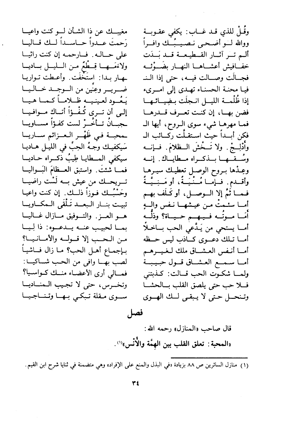 [فَصْلٌ الْمَحَبَّةُ تَعَلُّقُ الْقَلْبِ بَيْنَ الْهِمَّةِ وَالْأُنْسِ]