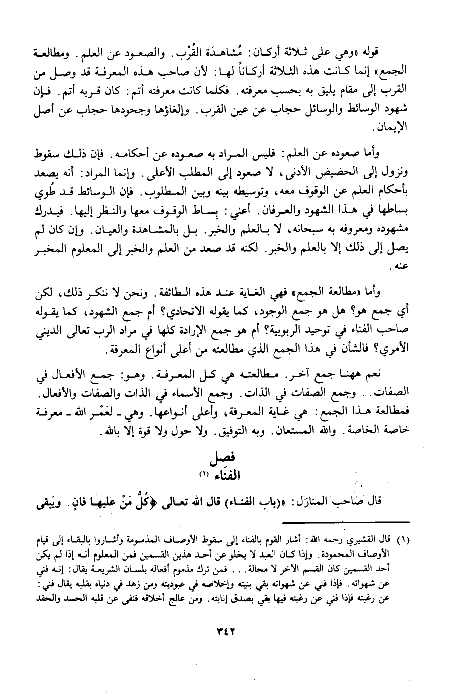 وَأَمَّا مُطَالَعَةُ الْجَمْعِ فَهِيَ الْغَايَةُ عِنْدَ هَذِهِ الطَّائِفَةِ: وَنَحْنُ لَا نُنْكِرُ ذَلِكَ، لَكِنْ أَيُّ جَمْعٍ هُوَ؟ هَلْ هُوَ جَمْعُ الْوُجُودِ، كَمَا يَقُولُهُ الِاتِّحَادِيُّ؟ أَمْ جَمْعُ الشُّهُودِ، كَمَا يَقُولُهُ صَاحِبُ الْفَنَاءِ فِي تَوْحِيدِ الرُّبُوبِيَّةِ؟ أَمْ هُوَ جَمْعُ الْإِرَادَةِ كُلِّهَا فِي مُرَادِ الرَّبِّ تَعَالَى الدِّينِيِّ الْأَمْرِيِّ؟ فَالشَّأْنُ فِي هَذَا الْجَمْعِ الَّذِي مُطَالَعَتُهُ مِنْ أَعْلَى أَنْوَاعِ الْمَعْرِفَةِ.