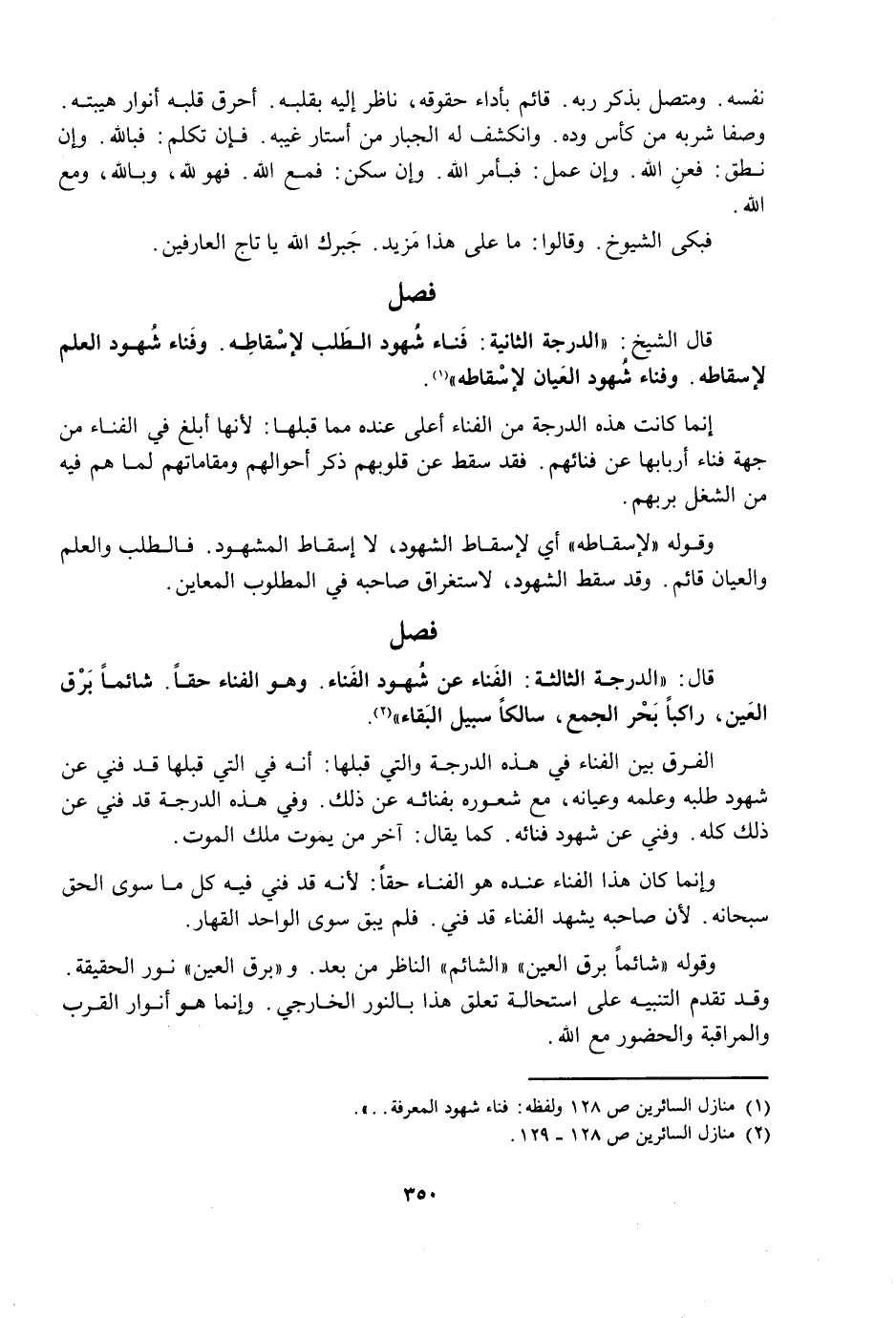قَالَ: الدَّرَجَةُ الثَّالِثَةُ: الْفَنَاءُ عَنْ شُهُودِ الْفَنَاءِ، وَهُوَ الْفَنَاءُ حَقًّا، شَائِمًا بَرْقَ الْعَيْنِ، رَاكِبًا بَحْرَ الْجَمْعِ، سَالِكًا سَبِيلَ الْبَقَاءِ.
