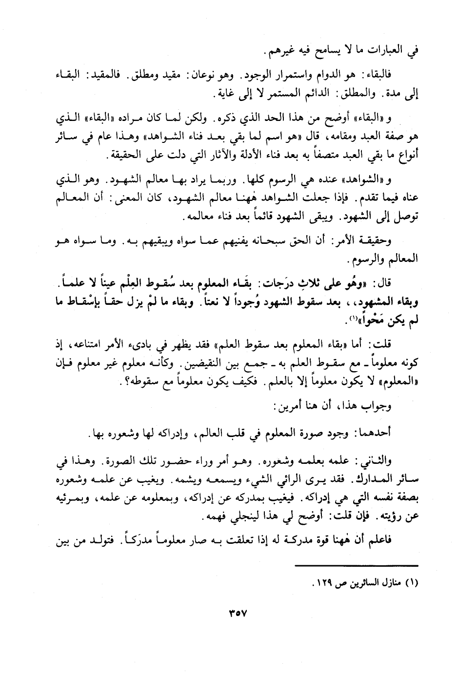 وَ " الْبَقَاءُ " أَوْضَحُ مِنْ هَذَا الْحَدِّ الَّذِي ذَكَرَهُ، وَلَكِنْ لَمَّا كَانَ مُرَادُهُ " الْبَقَاءَ " الَّذِي هُوَ صِفَةُ الْعَبْدِ وَمَقَامُهُ، قَالَ: " هُوَ اسْمٌ لِمَا بَقِيَ بَعْدَ فَنَاءِ الشَّوَاهِدِ "، وَهَذَا عَامٌّ فِي سَائِرِ أَنْوَاعِ مَا بَقِيَ الْعَبْدُ مُتَّصِفًا بِهِ بَعْدَ فَنَاءِ الْأَدِلَّةِ وَالْآثَارِ الَّتِي دَلَّتْ عَلَى الْحَقِيقَةِ.