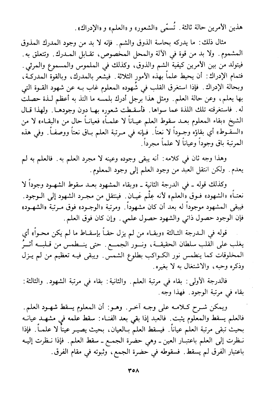 مِثَالُ ذَلِكَ: مَا يُدْرِكُهُ بِحَاسَّةِ الذَّوْقِ وَالشَّمِّ، فَإِنَّهُ لَابُدَّ مِنْ وُجُودِ الْمُدْرَكِ الْمَذُوقِ الْمَشْمُومِ، وَلَابُدَّ مِنْ قُوَّةٍ فِي الْآلَةِ وَالْمَحَلِّ الْمَخْصُوصِ، تُقَابِلُ الْمُدْرَكَ، وَتَتَعَلَّقُ بِهِ، فَيَتَوَلَّدُ مِنْ بَيْنِ الْأَمْرَيْنِ كَيْفِيَّةُ الشَّمِّ وَالذَّوْقِ، وَكَذَلِكَ فِي الْمَلْمُوسِ وَالْمَسْمُوعِ وَالْمَرْئِيِّ، فَتَمَامُ الْإِدْرَاكِ أَنْ يُحِيطَ عِلْمًا بِهَذِهِ الْأُمُورِ الثَّلَاثَةِ، فَيَشْعُرُ بِالْمُدْرَكِ، وَبِالْقُوَّةِ الْمُدْرِكَةِ، وَبِحَالَةِ الْإِدْرَاكِ، فَإِذَا اسْتَغْرَقَ الْقَلْبُ فِي شُهُودِهِ الْمَعْلُومَ غَابَ بِهِ عَنْ شُهُودِ الْقُوَّةِ الَّتِي بِهَا يَعْلَمُ، وَعَنْ حَالَةِ الْعِلْمِ، وَمَثَّلَ هَذَا بِرَجُلٍ أَدْرَكَ بِلَمْسِهِ مَا الْتَذَّ بِهِ أَعْظَمَ لَذَّةٍ حَصُلَتْ لَهُ، فَاسْتَغْرَقَتْهُ تِلْكَ اللَّذَّةُ عَمَّا سِوَاهَا، فَأَسْقَطَتْ شُعُورَهُ بِهَا دُونَ وُجُودِهَا، وَلِهَذَا قَالَ الشَّيْخُ " بَقَاءُ الْمَعْلُومِ بَعْدَ سُقُوطِ الْعِلْمِ عَيَانًا لَا عِلْمًا " فَعَيَانًا حَالٌ مِنَ الْبَقَاءِ لَا مِنَ السُّقُوطِ أَيْ بَقَاؤُهُ وُجُودًا لَا نَعْتًا، فَإِنَّهُ فِي مَرْتَبَةِ الْعِلْمِ بَاقٍ نَعْتًا وَوَصْفًا، وَفِي هَذِهِ الْمَرْتَبَةِ بَاقٍ وُجُودًا وَعَيَانًا لَا عِلْمًا مُجَرَّدًا.
