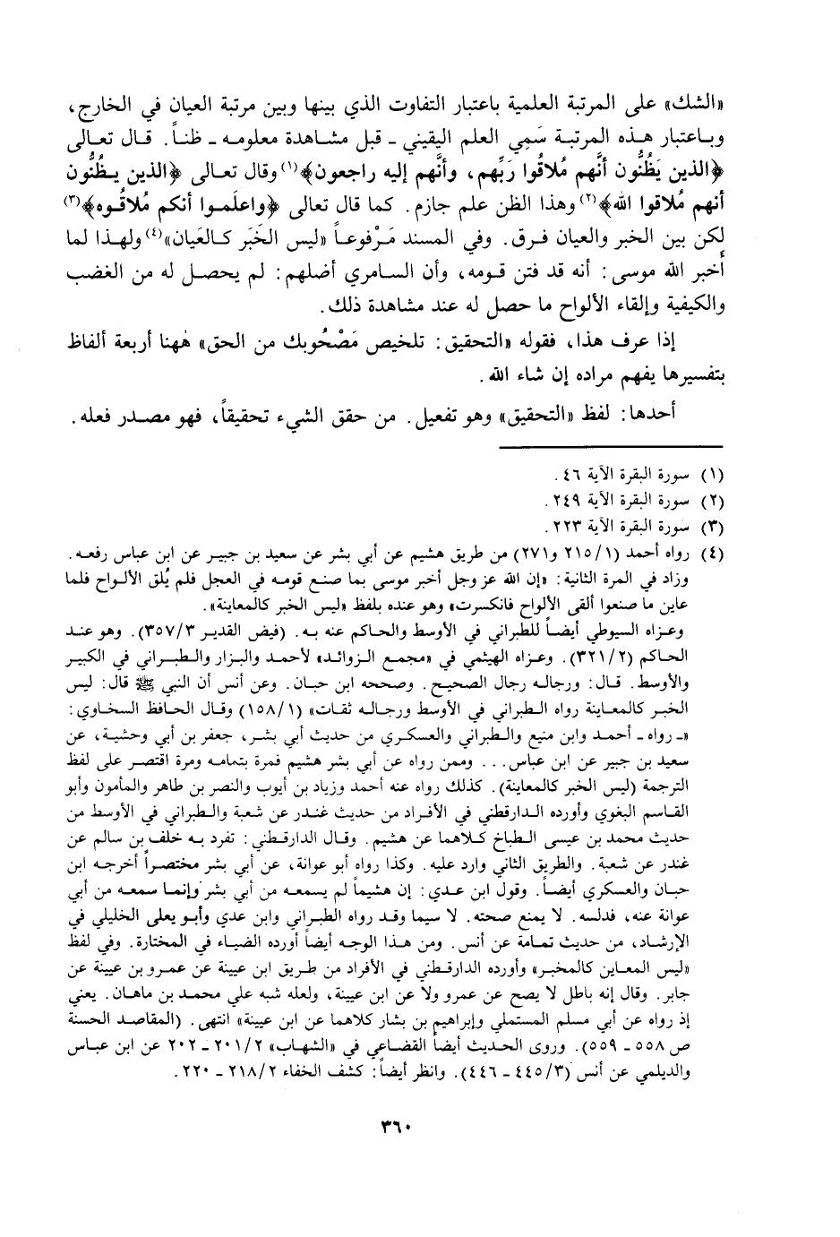 " الشَّكِّ " عَلَى الْمَرْتَبَةِ الْعِلْمِيَّةِ بِاعْتِبَارِ التَّفَاوُتِ الَّذِي بَيْنَهَا وَبَيْنَ مَرْتَبَةِ الْعِيَانِ فِي الْخَارِجِ، وَبِاعْتِبَارِ هَذِهِ الْمَرْتَبَةِ سُمِّيَ الْعِلْمُ الْيَقِينِيُّ - قَبْلَ مُشَاهَدَةِ مَعْلُومِهِ - ظَنًّا، قَالَ تَعَالَى {الَّذِينَ يَظُنُّونَ أَنَّهُمْ مُلَاقُو رَبِّهِمْ وَأَنَّهُمْ إِلَيْهِ رَاجِعُونَ} [البقرة: 46] وَقَالَ تَعَالَى {الَّذِينَ يَظُنُّونَ أَنَّهُمْ مُلَاقُو اللَّهِ} [البقرة: 249] وَهَذَا الظَّنُّ عِلْمٌ جَازِمٌ، كَمَا قَالَ تَعَالَى {وَاعْلَمُوا أَنَّكُمْ مُلَاقُوهُ} [البقرة: 223] لَكِنْ بَيْنَ الْخَبَرِ وَالْعِيَانِ فَرْقٌ، وَفِي الْمُسْنَدِ مَرْفُوعًا «لَيْسَ الْخَبَرُ كَالْعِيَانِ» وَلِهَذَا لَمَّا أَخْبَرَ اللَّهُ مُوسَى أَنَّهُ قَدْ فُتِنَ قَوْمُهُ، وَأَنَّ السَّامِرِيَّ أَضَلَّهُمْ لَمْ يَحْصُلْ لَهُ مِنَ الْغَضَبِ وَالْكَيْفِيَّةِ وَإِلْقَاءِ الْأَلْوَاحِ مَا حَصَلَ لَهُ عِنْدَ مُشَاهَدَةِ ذَلِكَ.