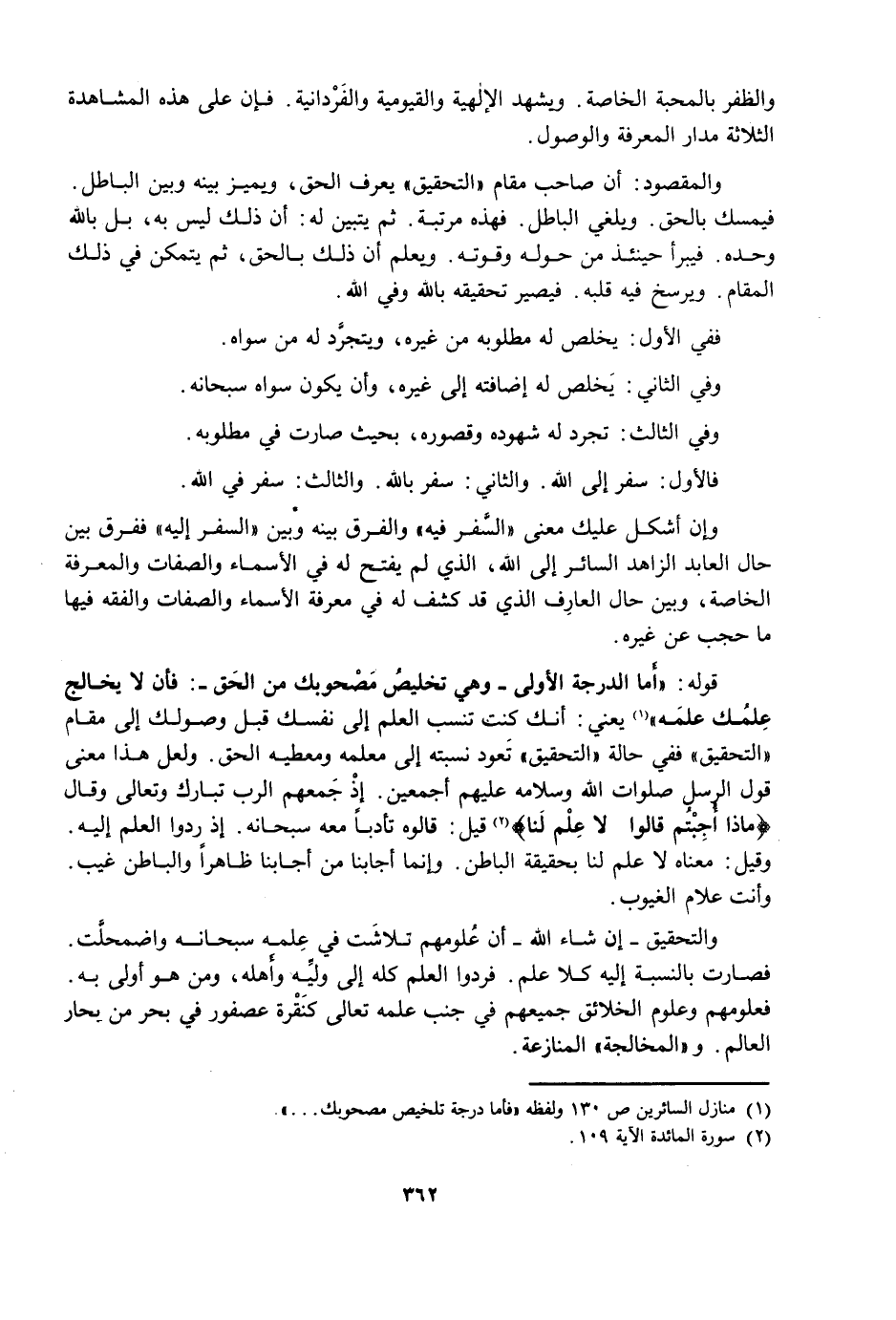 وَالظَّفَرِ بِالْمَحَبَّةِ الْخَاصَّةِ، وَيَشْهَدُ الْإِلَهِيَّةَ وَالْقَيُّومِيَّةَ وَالْفَرْدَانِيَّةَ، فَإِنَّ عَلَى هَذِهِ الْمَشَاهِدِ الثَّلَاثَةِ مَدَارُ الْمَعْرِفَةِ وَالْوُصُولِ.