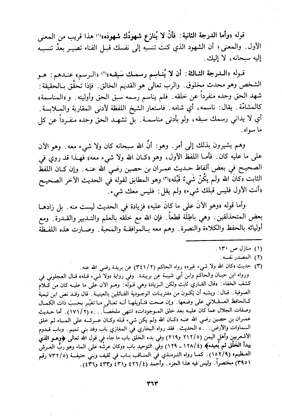 وَهُمْ يُشِيرُونَ بِذَلِكَ إِلَى أَمْرٍ، وَهُوَ: أَنَّ اللَّهَ سُبْحَانَهُ كَانَ وَلَا شَيْءَ مَعَهُ، وَهُوَ الْآنَ عَلَى مَا عَلَيْهِ كَانَ، فَأَمَّا اللَّفْظُ الْأَوَّلُ وَهُوَ " «كَانَ اللَّهُ وَلَا شَيْءَ مَعَهُ» " فَهَذَا قَدْ رُوِيَ فِي الصَّحِيحِ فِي بَعْضِ أَلْفَاظِ حَدِيثِ عِمْرَانَ بْنِ حُصَيْنٍ رَضِيَ اللَّهُ عَنْهُ، وَإِنْ كَانَ اللَّفْظُ الثَّابِتُ «كَانَ اللَّهُ وَلَمْ يَكُنْ شَيْءٌ قَبْلَهُ» وَهُوَ الْمُطَابِقُ لِقَوْلِهِ فِي الْحَدِيثِ الْآخَرِ الصَّحِيحِ «أَنْتَ الْأَوَّلُ فَلَيْسَ قَبْلَكَ شَيْءٌ» وَلَمْ يَقُلْ: فَلَيْسَ مَعَكَ شَيْءٌ.