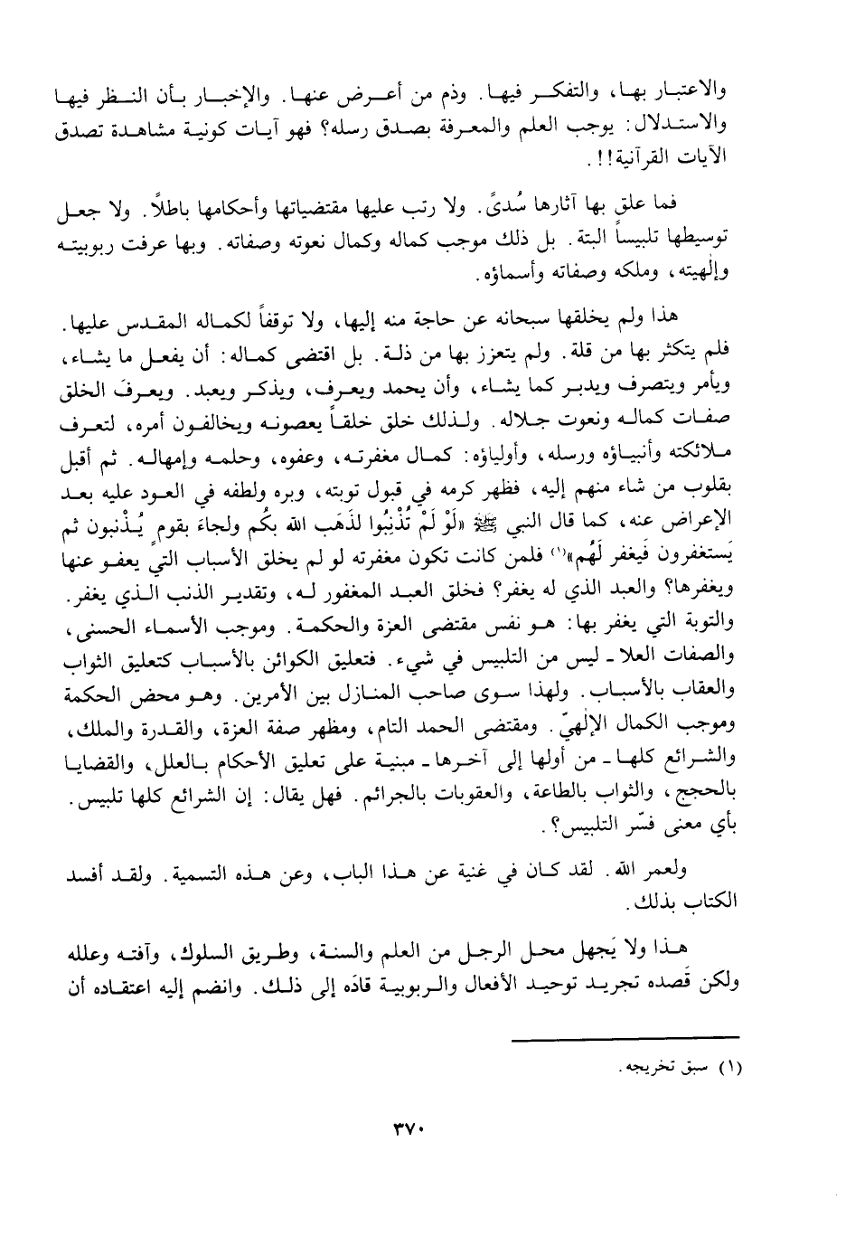 هَذَا وَلَمْ يَخْلُقْهَا سُبْحَانَهُ عَنْ حَاجَةٍ مِنْهُ إِلَيْهَا، وَلَا تَوَقُّفًا لِكَمَالِهِ الْمُقَدَّسِ عَلَيْهَا، فَلَمْ يَتَكَثَّرْ بِهَا مِنْ قِلَّةٍ، وَلَمْ يَتَعَزَّزْ بِهَا مِنْ ذِلَّةٍ، بَلِ اقْتَضَى كَمَالُهُ أَنْ يَفْعَلَ مَا يَشَاءُ، وَيَأْمُرَ وَيَتَصَرَّفَ وَيُدَبِّرَ كَمَا يَشَاءُ، وَأَنْ يُحْمَدَ وَيُعْرَفَ، وَيُذْكَرَ وَيُعْبَدَ، وَيَعْرِفَ الْخَلْقُ صِفَاتِ كَمَالِهِ وَنُعُوتَ جَلَالِهِ، وَلِذَلِكَ خَلَقَ خَلْقًا يَعْصُونَهُ وَيُخَالِفُونَ أَمْرَهُ، لِتَعْرِفَ مَلَائِكَتُهُ وَأَنْبِيَاؤُهُ وَرُسُلُهُ، وَأَوْلِيَاؤُهُ كَمَالَ مَغْفِرَتِهِ، وَعَفْوِهِ، وَحِلْمِهِ وَإِمْهَالِهِ، ثُمَّ أَقْبَلَ بِقُلُوبِ مَنْ شَاءَ مِنْهُمْ إِلَيْهِ، فَظَهَرَ كَرَمُهُ فِي قَبُولِ تَوْبَتِهِ، وَبِرِّهِ وَلُطْفِهِ فِي الْعَوْدِ عَلَيْهِ بَعْدَ الْإِعْرَاضِ عَنْهُ، كَمَا قَالَ النَّبِيُّ - صَلَّى اللَّهُ عَلَيْهِ وَسَلَّمَ - «لَوْ لَمْ تُذْنِبُوا لَذَهَبَ اللَّهُ بِكُمْ وَلَجَاءَ بِقَوْمٍ يُذْنِبُونَ ثُمَّ يَسْتَغْفِرُونَ فَيُغْفَرُ لَهُمْ» فَلِمَنْ كَانَتْ تَكُونُ مَغْفِرَتُهُ لَوْ لَمْ يَخْلُقِ الْأَسْبَابَ الَّتِي يَعْفُو عَنْهَا وَيَغْفِرُهَا؟ وَالْعَبْدَ الَّذِي لَهُ يَغْفِرُ؟ فَخَلْقُ الْعَبْدِ الْمَغْفُورِ لَهُ، وَتَقْدِيرُ الذَّنْبِ الَّذِي يُغْفَرُ، وَالتَّوْبَةُ الَّتِي يَغْفِرُ بِهَا هُوَ نَفْسُ مُقْتَضَى الْعِزَّةِ وَالْحِكْمَةِ، وَمُوجَبُ الْأَسْمَاءِ الْحُسْنَى، وَالصِّفَاتِ الْعُلَا - لَيْسَ مِنَ التَّلْبِيسِ فِي شَيْءٍ، فَتَعْلِيقُ الْكَوَائِنِ بِالْأَسْبَابِ كَتَعْلِيقِ الثَّوَابِ وَالْعِقَابِ بِالْأَسْبَابِ، وَلِهَذَا سَوَّى صَاحِبُ الْمَنَازِلِ بَيْنَ الْأَمْرَيْنِ، وَهُوَ مَحْضُ الْحِكْمَةِ وَمُوجَبُ الْكَمَالِ الْإِلَهِيِّ، وَمُقْتَضَى الْحَمْدِ التَّامِّ، وَمَظْهَرُ صِفَةِ الْعِزَّةِ، وَالْقُدْرَةِ وَالْمُلْكِ، وَالشَّرَائِعُ كُلُّهَا - مِنْ أَوَّلِهَا إِلَى آخِرِهَا - مَبْنِيَّةٌ عَلَى تَعْلِيقِ الْأَحْكَامِ بِالْعِلَلِ، وَالْقَضَايَا بِالْحُجَجِ، وَالثَّوَابِ بِالطَّاعَةِ، وَالْعُقُوبَاتِ بِالْجَرَائِمِ، فَهَلْ يُقَالُ: إِنَّ الشَّرَائِعَ كُلَّهَا تَلْبِيسٌ، بِأَيِّ مَعْنًى فُسِّرَ التَّلْبِيسُ؟