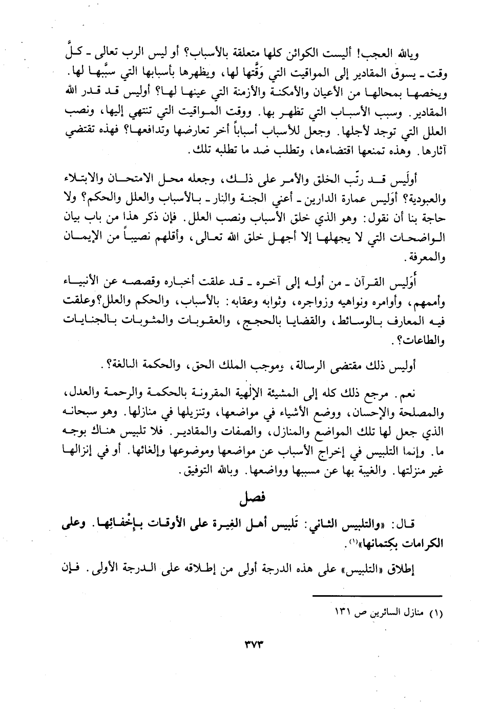 نَعَمْ، مَرْجِعُ ذَلِكَ كُلِّهِ إِلَى الْمَشِيئَةِ الْإِلَهِيَّةِ الْمَقْرُونَةِ بِالْحِكْمَةِ وَالرَّحْمَةِ وَالْعَدْلِ، وَالْمَصْلَحَةِ وَالْإِحْسَانِ، وَوَضْعِ الْأَشْيَاءِ فِي مَوَاضِعِهَا، وَتَنْزِيلِهَا فِي مَنَازِلِهَا، وَهُوَ سُبْحَانَهُ الَّذِي جَعَلَ لَهَا تِلْكَ الْمَوَاضِعَ وَالْمَنَازِلَ، وَالصِّفَاتِ وَالْمَقَادِيرَ، فَلَا تَلْبِيسَ هُنَاكَ بِوَجْهٍ مَا، وَإِنَّمَا التَّلْبِيسُ فِي إِخْرَاجِ الْأَسْبَابِ عَنْ مَوَاضِعِهَا وَمَوْضُوعِهَا وَإِلْغَائِهَا، أَوْ فِي إِنْزَالِهَا غَيْرَ مَنْزِلَتِهَا، وَالْغَيْبَةِ بِهَا عَنْ مُسَبِّبِهَا وَوَاضِعِهَا، وَبِاللَّهِ التَّوْفِيقُ.