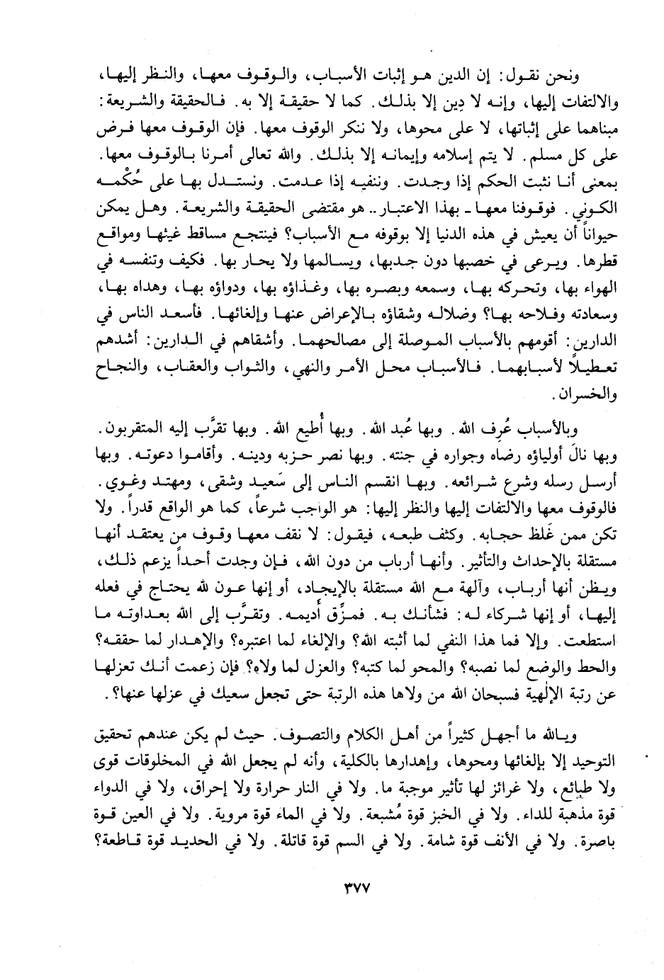 وَبِالْأَسْبَابِ عُرِفَ اللَّهُ، وَبِهَا عُبِدَ اللَّهُ، وَبِهَا أُطِيعَ اللَّهُ، وَبِهَا تَقَرَّبَ إِلَيْهِ الْمُتَقَرِّبُونَ، وَبِهَا نَالَ أَوْلِيَاؤُهُ رِضَاهُ وَجِوَارَهُ فِي جَنَّتِهِ، وَبِهَا نُصِرَ حِزْبُهُ وَدِينُهُ، وَأَقَامُوا دَعْوَتَهُ، وَبِهَا أَرْسَلَ رُسُلَهُ وَشَرَعَ شَرَائِعَهُ، وَبِهَا انْقَسَمَ النَّاسُ إِلَى سَعِيدٍ وَشَقِيٍّ، وَمُهْتَدٍ وَغَوِيٍّ، فَالْوُقُوفُ مَعَهَا وَالِالْتِفَاتُ إِلَيْهَا وَالنَّظَرُ إِلَيْهَا: هُوَ الْوَاجِبُ شَرْعًا، كَمَا هُوَ الْوَاقِعُ قَدَرًا، وَلَا تَكُنْ مِمَّنْ غَلُظَ حِجَابُهُ، وَكَثُفَ طَبْعُهُ فَيَقُولُ: لَا نَقِفُ مَعَهَا وُقُوفَ مَنْ يَعْتَقِدُ أَنَّهَا مُسْتَقِلَّةٌ بِالْإِحْدَاثِ وَالتَّأْثِيرِ، وَأَنَّهَا أَرْبَابٌ مِنْ دُونِ اللَّهِ، فَإِنْ وَجَدْتَ أَحَدًا يَزْعُمُ ذَلِكَ، وَيَظُنُّ أَنَّهَا أَرْبَابٌ، وَآلِهَةٌ مَعَ اللَّهِ مُسْتَقِلَّةٌ بِالْإِيجَادِ، أَوْ أَنَّهَا عَوْنٌ لِلَّهِ يَحْتَاجُ فِي فِعْلِهِ إِلَيْهَا، أَوْ أَنَّهَا شُرَكَاءُ لَهُ: فَشَأْنُكَ بِهِ، فَمَزِّقْ أَدِيمَهُ، وَتَقَرَّبْ إِلَى اللَّهِ بِعَدَاوَتِهِ مَا اسْتَطَعْتَ، وَإِلَّا فَمَا هَذَا النَّفْيُ لِمَا أَثْبَتَهُ اللَّهُ؟ وَالْإِلْغَاءُ لِمَا اعْتَبَرَهُ؟ وَالْإِهْدَارُ لِمَا حَقَّقَهُ؟ وَالْحَطُّ وَالْوَضْعُ لِمَا نَصَبَهُ؟ وَالْمَحْوُ لِمَا كَتَبَهُ؟ وَالْعَزْلُ لِمَا وَلَّاهُ؟ فَإِنْ زَعَمَتْ أَنَّكَ تَعْزِلُهَا عَنْ رُتْبَةِ الْإِلَهِيَّةِ فَسُبْحَانَ اللَّهِ مَنْ وَلَّاهَا هَذِهِ الرُّتْبَةَ حَتَّى تَجْعَلَ سَعْيَكَ فِي عَزْلِهَا عَنْهَا؟