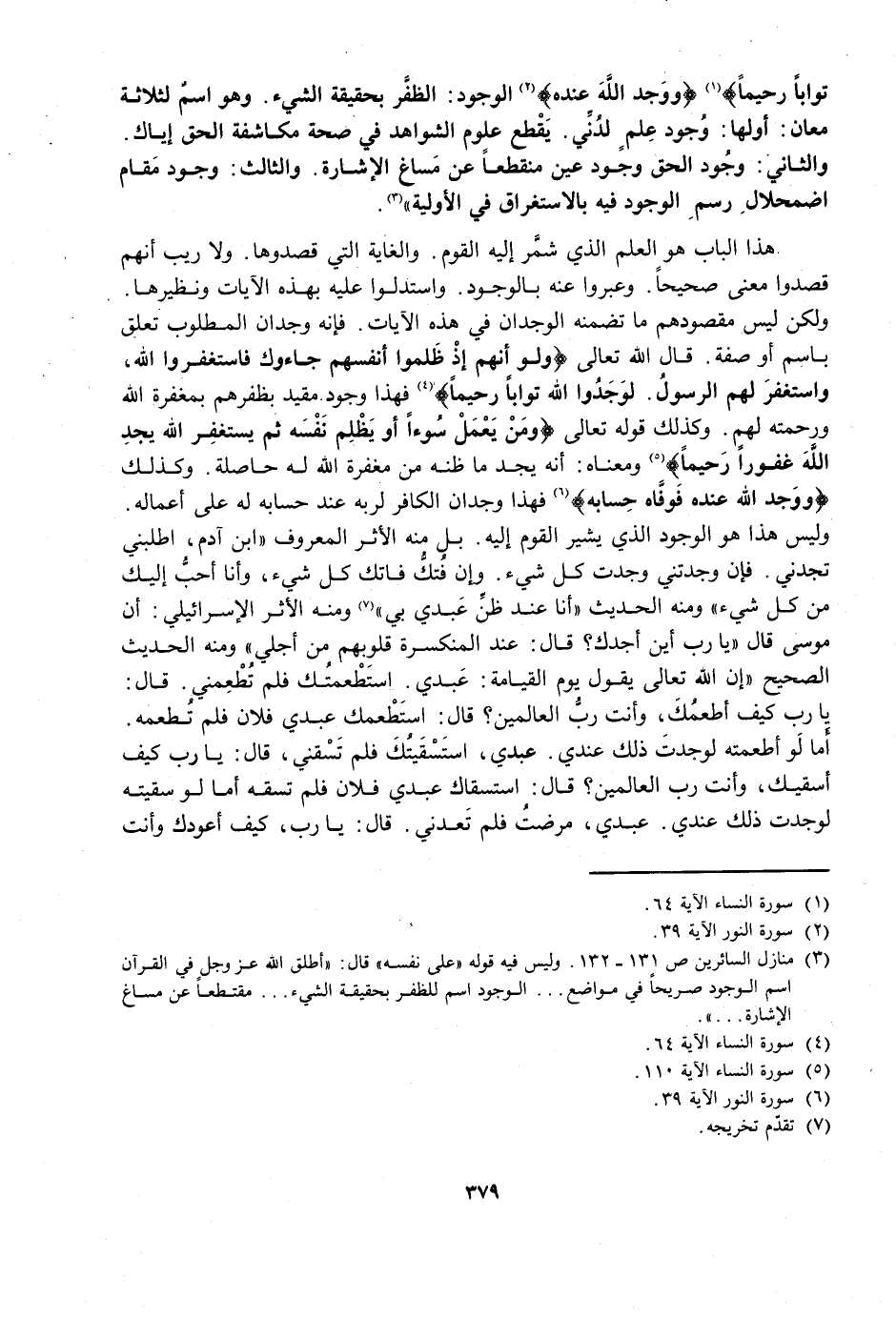 هَذَا الْبَابُ هُوَ الْعِلْمُ الَّذِي شَمَّرَ إِلَيْهِ الْقَوْمُ، وَالْغَايَةُ الَّتِي قَصَدُوهَا، وَلَا رَيْبَ أَنَّهُمْ قَصَدُوا مَعْنًى صَحِيحًا، وَعَبَّرُوا عَنْهُ بِالْوُجُودِ، وَاسْتَدَلُّوا عَلَيْهِ بِهَذِهِ الْآيَاتِ وَنَظِيرِهَا، وَلَكِنْ لَيْسَ مَقْصُودُهُمْ مَا تَضَمَّنُهُ الْوِجْدَانُ فِي هَذِهِ الْآيَاتِ، فَإِنَّهُ وِجْدَانُ الْمَطْلُوبِ تَعَلَّقَ بِاسْمٍ أَوْ صِفَةٍ، قَالَ اللَّهُ تَعَالَى {وَلَوْ أَنَّهُمْ إِذْ ظَلَمُوا أَنْفُسَهُمْ جَاءُوكَ فَاسْتَغْفَرُوا اللَّهَ وَاسْتَغْفَرَ لَهُمُ الرَّسُولُ لَوَجَدُوا اللَّهَ تَوَّابًا رَحِيمًا} [النساء: 64] فَهَذَا وُجُودٌ مُقَيَّدٌ بِظَفَرِهِمْ بِمَغْفِرَةِ اللَّهِ وَرَحْمَتِهِ لَهُمْ، وَكَذَلِكَ قَوْلُهُ تَعَالَى {وَمَنْ يَعْمَلْ سُوءًا أَوْ يَظْلِمْ نَفْسَهُ ثُمَّ يَسْتَغْفِرِ اللَّهَ يَجِدِ اللَّهَ غَفُورًا رَحِيمًا} [النساء: 110] وَمَعْنَاهُ: أَنَّهُ يَجِدُ مَا ظَنَّهُ مَنْ مَغْفِرَةُ اللَّهِ لَهُ حَاصِلَةٌ، وَكَذَلِكَ {وَوَجَدَ اللَّهَ عِنْدَهُ فَوَفَّاهُ حِسَابَهُ} [النور: 39] فَهَذَا وِجْدَانُ الْكَافِرِ لِرَبِّهِ عِنْدَ حِسَابِهِ لَهُ عَلَى أَعْمَالِهِ، وَلَيْسَ هَذَا هُوَ الْوُجُودَ الَّذِي يُشِيرُ الْقَوْمُ إِلَيْهِ، بَلْ مِنْهُ الْأَثَرُ الْمَعْرُوفُ «ابْنَ آدَمَ، اطْلُبْنِي تَجِدْنِي، فَإِنْ وَجَدْتَنِي وَجَدْتَ كُلَّ شَيْءٍ، وَإِنْ فُتُّكَ فَاتَكَ كُلُّ شَيْءٍ، وَأَنَا أَحَبُّ إِلَيْكَ مِنْ كُلِّ شَيْءٍ،» وَمِنْهُ الْحَدِيثُ «أَنَا عِنْدَ ظَنِّ عَبْدِي بِي،» وَمِنْهُ الْأَثَرُ الْإِسْرَائِيلِيُّ: أَنَّ مُوسَى قَالَ: يَا رَبِّ أَيْنَ أَجِدُكَ؟ قَالَ: عِنْدَ الْمُنْكَسِرَةِ قُلُوبُهُمْ مِنْ أَجْلِي، وَمِنْهُ الْحَدِيثُ الصَّحِيحُ «إِنَّ اللَّهَ تَعَالَى يَقُولُ يَوْمَ الْقِيَامَةِ: عَبْدِي، اسْتَطْعَمْتُكَ فَلَمْ تُطْعِمْنِي، قَالَ: يَا رَبِّ كَيْفَ أُطْعِمُكَ، وَأَنْتَ رَبُّ الْعَالَمِينَ؟ قَالَ: اسْتَطْعَمَكَ عَبْدِي فُلَانٌ فَلَمْ تُطْعِمْهُ، أَمَا لَوْ أَطْعَمْتَهُ لَوَجَدَتْ ذَلِكَ عِنْدِي، عَبْدِي اسْتَسْقَيْتُكَ فَلَمْ تَسْقِنِي، قَالَ: يَا رَبِّ كَيْفَ أَسْقِيكَ، وَأَنْتَ رَبُّ الْعَالَمِينَ؟ قَالَ: اسْتَسْقَاكَ عَبْدِي فُلَانٌ فَلَمْ تَسْقِهِ أَمَا لَوْ سَقَيْتَهُ لَوَجَدْتَ ذَلِكَ عِنْدِي، عَبْدِي مَرِضْتُ فَلَمْ تَعُدْنِي، قَالَ: يَا رَبِّ، كَيْفَ أَعُودُكَ وَأَنْتَ