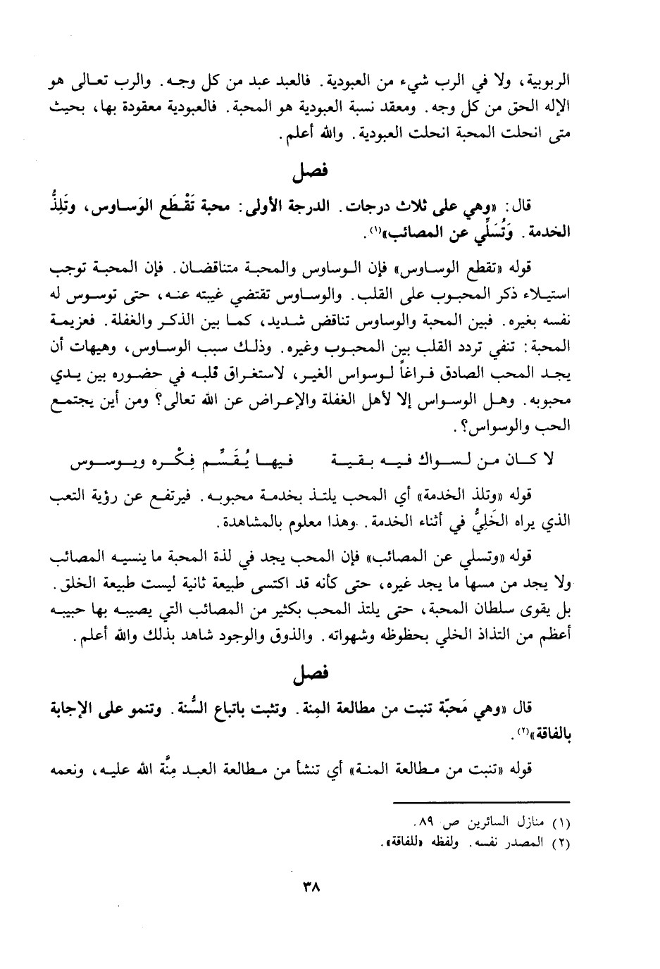 الرُّبُوبِيَّةِ، وَلَا فِي الرَّبِّ شَيْءٌ مِنَ الْعُبُودِيَّةِ. فَالْعَبْدُ عَبْدٌ مِنْ كُلِّ وَجْهٍ. وَالرَّبُّ تَعَالَى هُوَ الْإِلَهُ الْحَقُّ مِنْ كُلِّ وَجْهٍ. وَمَعْقِدُ نِسْبَةِ الْعُبُودِيَّةِ هُوَ الْمَحَبَّةُ. فَالْعُبُودِيَّةُ مَعْقُودَةٌ بِهَا، بِحَيْثُ مَتَى انْحَلَّتِ الْمَحَبَّةُ انْحَلَّتِ الْعُبُودِيَّةُ. وَاللَّهُ أَعْلَمُ.