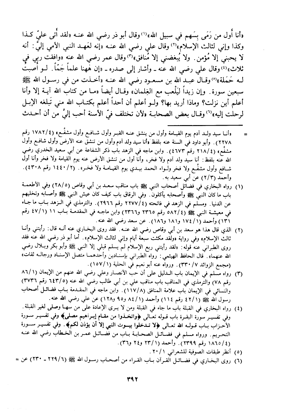 أَنَا أَوَّلُ مَنْ رَمَى بِسَهْمٍ فِي سَبِيلِ اللَّهِ، وَقَالَ أَبُو ذَرٍّ رَضِيَ اللَّهُ عَنْهُ: لَقَدْ أَتَى عَلَيَّ كَذَا وَكَذَا وَإِنِّي لِثَالِثُ الْإِسْلَامِ، وَقَالَ عَلِيٌّ رَضِيَ اللَّهُ عَنْهُ: إِنَّهُ لَعَهْدُ النَّبِيِّ الْأُمِّيِّ إِلَيَّ: أَنَّهُ لَا يُحِبُّنِي إِلَّا مُؤْمِنٌ، وَلَا يُبْغِضُنِي إِلَّا مُنَافِقٌ، وَقَالَ عُمَرُ رَضِيَ اللَّهُ عَنْهُ: وَافَقْتُ رَبِّي فِي ثَلَاثٍ، وَقَالَ عَلِيٌّ رَضِيَ اللَّهُ عَنْهُ - وَأَشَارَ إِلَى صَدْرِهِ: إِنَّ هَاهُنَا عِلْمًا جَمًّا، لَوْ أَصَبْتُ لَهُ حَمَلَةً، وَقَالَ عَبْدُ اللَّهِ بْنُ مَسْعُودٍ رَضِيَ اللَّهُ عَنْهُ: أَخَذْتُ مِنْ فِي رَسُولِ اللَّهِ - صَلَّى اللَّهُ عَلَيْهِ وَسَلَّمَ - سَبْعِينَ سُورَةً، وَإِنَّ زَيْدًا لَيَلْعَبُ مَعَ الْغِلْمَانِ، وَقَالَ أَيْضًا: مَا مِنْ كِتَابِ اللَّهِ آيَةٌ إِلَّا وَأَنَا أَعْلَمُ أَيْنَ نَزَلَتْ؟ وَمَاذَا أُرِيدَ بِهَا؟ وَلَوْ أَعْلَمُ أَنَّ أَحَدًا أَعْلَمُ بِكِتَابِ اللَّهِ مِنِّي تَبْلُغُهُ الْإِبِلُ لَرَحَلْتُ إِلَيْهِ، وَقَالَ بَعْضُ الصَّحَابَةِ: لَأَنْ تَخْتَلِفُ فِيَّ الْأَسِنَّةُ أَحَبُّ إِلَيَّ مِنْ أَنْ أُحَدِّثَ