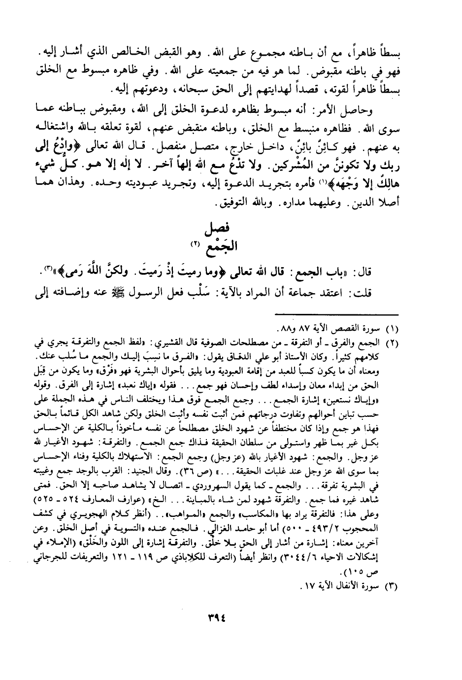 وَحَاصِلُ الْأَمْرِ: أَنَّهُ مَبْسُوطٌ بِظَاهِرِهِ لِدَعْوَةِ الْخَلْقِ إِلَى اللَّهِ، وَمَقْبُوضٌ بِبَاطِنِهِ عَمَّا سِوَى اللَّهِ، فَظَاهِرُهُ مُنْبَسِطٌ مَعَ الْخَلْقِ، وَبَاطِنُهُ مُنْقَبِضٌ عَنْهُمْ، لِقُوَّةِ تَعَلُّقِهِ بِاللَّهِ وَاشْتِغَالِهِ بِهِ عَنْهُمْ، فَهُوَ كَائِنٌ بَائِنٌ، دَاخِلٌ خَارِجٌ، مُتَّصِلٌ مُنْفَصِلٌ، قَالَ اللَّهُ تَعَالَى: {وَادْعُ إِلَى رَبِّكَ وَلَا تَكُونَنَّ مِنَ الْمُشْرِكِينَ - وَلَا تَدْعُ مَعَ اللَّهِ إِلَهًا آخَرَ لَا إِلَهَ إِلَّا هُوَ كُلُّ شَيْءٍ هَالِكٌ إِلَّا وَجْهَهُ} [القصص: 87 - 88] فَأَمَرَهُ بِتَجْرِيدِ الدَّعْوَةِ إِلَيْهِ، وَتَجْرِيدِ عُبُودِيَّتِهِ وَحْدَهُ، وَهَذَانِ هُمَا أَصْلَا الدِّينِ، وَعَلَيْهِمَا مَدَارُهُ، وَبِاللَّهِ التَّوْفِيقُ.