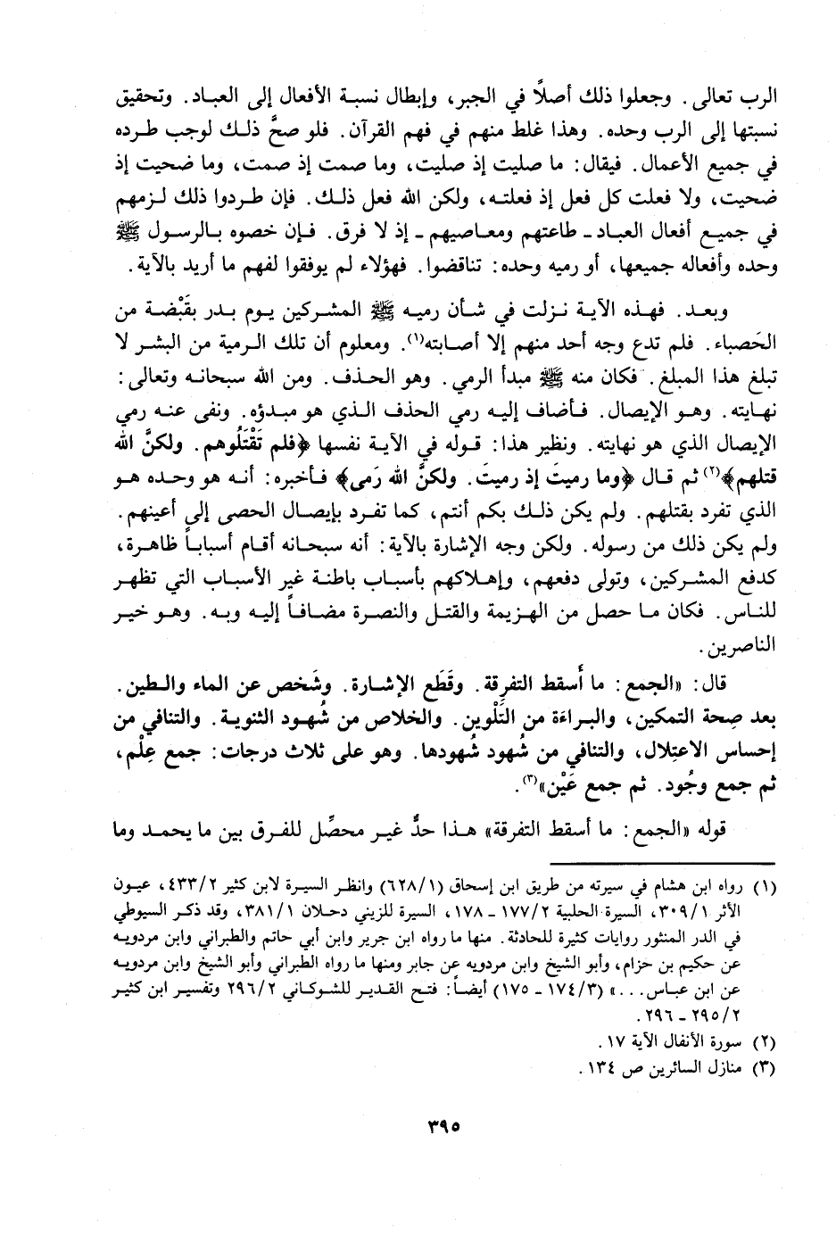 الرَّبِّ تَعَالَى، وَجَعَلُوا ذَلِكَ أَصْلًا فِي الْجَبْرِ، وَإِبْطَالِ نِسْبَةِ الْأَفْعَالِ إِلَى الْعِبَادِ، وَتَحْقِيقِ نِسْبَتِهَا إِلَى الرَّبِّ وَحْدَهُ، وَهَذَا غَلَطٌ مِنْهُمْ فِي فَهْمِ الْقُرْآنِ، فَلَوْ صَحَّ ذَلِكَ لَوَجَبَ طَرْدُهُ فِي جَمِيعِ الْأَعْمَالِ، فَيُقَالُ: مَا صَلَّيْتَ إِذْ صَلَّيْتَ، وَمَا صُمْتَ إِذْ صُمْتَ، وَمَا ضَحَّيْتَ إِذْ ضَحَّيْتَ، وَلَا فَعَلْتَ كُلَّ فِعْلٍ إِذْ فَعَلْتَهُ، وَلَكِنَّ اللَّهَ فَعَلَ ذَلِكَ، فَإِنْ طَرَدُوا ذَلِكَ لَزِمَهُمْ فِي جَمِيعِ أَفْعَالِ الْعِبَادِ - طَاعَتِهِمْ وَمَعَاصِيهِمْ - إِذْ لَا فَرْقَ، فَإِنْ خَصُّوهُ بِالرَّسُولِ - صَلَّى اللَّهُ عَلَيْهِ وَسَلَّمَ - وَحْدَهُ وَأَفْعَالِهِ جَمِيعِهَا، أَوْ رَمْيِهِ وَحْدَهُ؛ تَنَاقَضُوا، فَهَؤُلَاءِ لَمْ يُوَفَّقُوا لِفَهْمِ مَا أُرِيدَ بِالْآيَةِ.