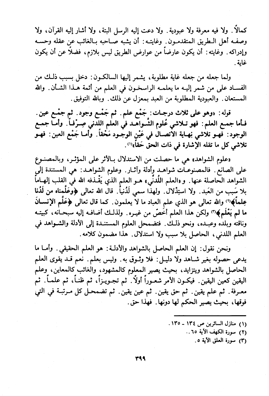 وَنَحْنُ نَقُولُ: إِنَّ الْعِلْمَ الْحَاصِلَ بِالشَّوَاهِدِ وَالْأَدِلَّةِ: هُوَ الْعِلْمُ الْحَقِيقِيُّ، وَأَمَّا مَا يَدَّعِي حُصُولَهُ بِغَيْرِ شَاهِدٍ وَلَا دَلِيلٍ: فَلَا وُثُوقَ بِهِ، وَلَيْسَ بِعِلْمٍ، نَعَمْ قَدْ يَقْوَى الْعِلْمُ الْحَاصِلُ بِالشَّوَاهِدِ وَيَتَزَايَدُ، بِحَيْثُ يَصِيرُ الْمَعْلُومُ كَالْمَشْهُودِ، وَالْغَائِبُ كَالْمُعَايَنِ، وَعِلْمُ الْيَقِينِ كَعَيْنِ الْيَقِينِ، فَيَكُونُ الْأَمْرُ شُعُورًا أَوَّلًا، ثُمَّ تَجْوِيزًا، ثُمَّ ظَنًّا، ثُمَّ عِلْمًا، ثُمَّ مَعْرِفَةً، ثُمَّ عِلْمَ يَقِينٍ، ثُمَّ حَقَّ يَقِينٍ، ثُمَّ عَيْنَ يَقِينٍ، ثُمَّ تَضْمَحِلُّ كُلُّ مَرْتَبَةٍ فِي الَّتِي فَوْقَهَا، بِحَيْثُ يَصِيرُ الْحُكْمُ لَهَا دُونَهَا، فَهَذَا حَقٌّ.