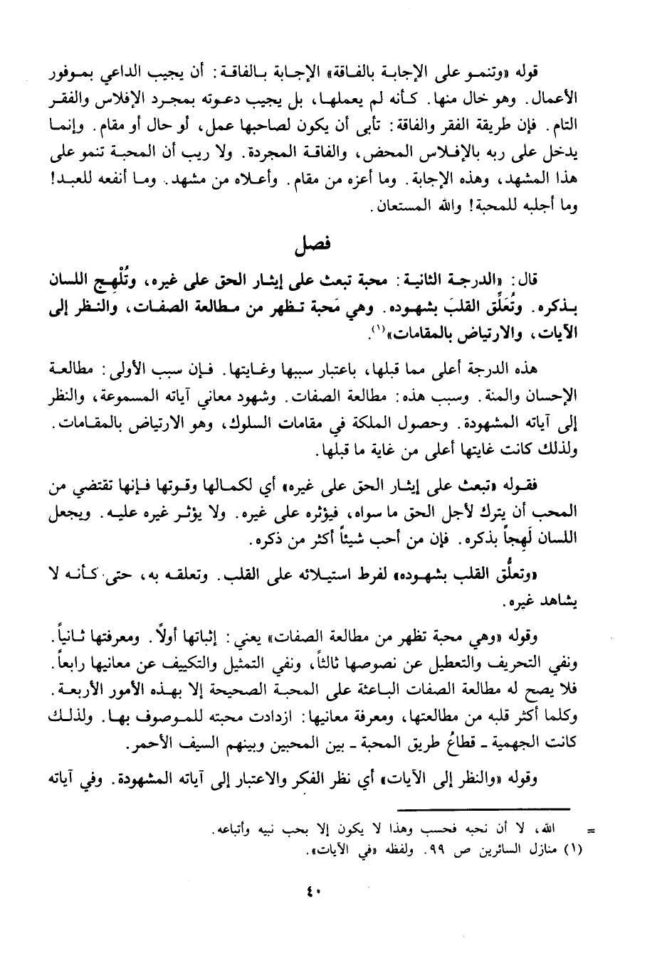 قَالَ: الدَّرَجَةُ الثَّانِيَةُ: مَحَبَّةٌ تَبْعَثُ عَلَى إِيثَارِ الْحَقِّ عَلَى غَيْرِهِ، وَتُلْهِجُ اللِّسَانَ بِذِكْرِهِ. وَتُعَلِّقَ الْقَلْبَ بِشُهُودِهِ. وَهِيَ مَحَبَّةٌ تَظْهَرُ مِنْ مُطَالَعَةِ الصِّفَاتِ، وَالنَّظَرِ إِلَى الْآيَاتِ، وَالِارْتِيَاضِ بِالْمَقَامَاتِ.