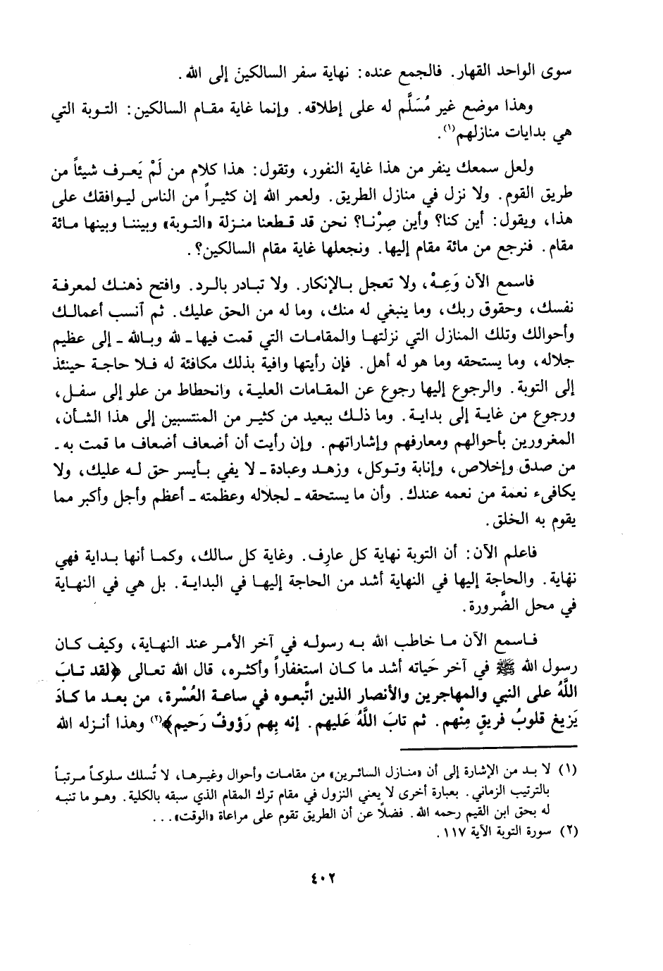وَلَعَلَّ سَمْعَكَ يَنْفِرُ مِنْ هَذَا غَايَةَ النُّفُورِ، وَتَقُولُ: هَذَا كَلَامُ مَنْ لَمْ يَعْرِفْ شَيْئًا مِنْ طَرِيقِ الْقَوْمِ، وَلَا نَزَلَ فِي مَنَازِلِ الطَّرِيقِ، وَلَعَمْرُ اللَّهِ إِنَّ كَثِيرًا مِنَ النَّاسِ لَيُوَافِقُكَ عَلَى هَذَا، وَيَقُولُ: أَيْنَ كُنَّا؟ وَأَيْنَ صِرْنَا؟ نَحْنُ قَدْ قَطَعْنَا مَنْزِلَةَ التَّوْبَةِ وَبَيْنَنَا وَبَيْنَهَا مِائَةُ مَقَامٍ، فَنَرْجِعُ مِنْ مِائَةِ مَقَامٍ إِلَيْهَا، وَنَجْعَلُهَا غَايَةَ مَقَامِ السَّالِكِينَ؟