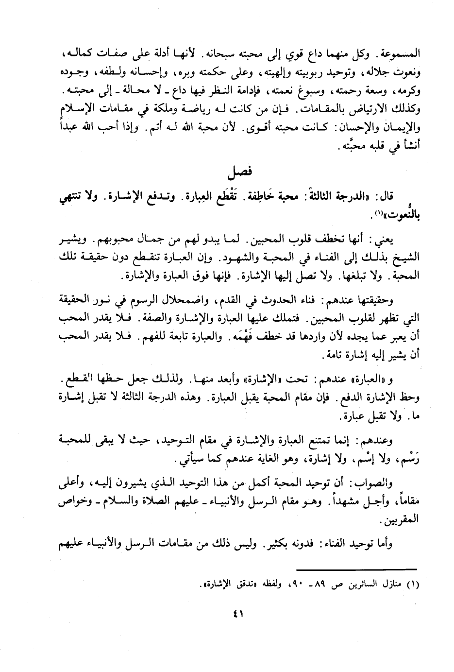 وَالْعِبَارَةُ عِنْدَهُمْ: تَحْتَ الْإِشَارَةِ وَأَبْعَدَ مِنْهَا. وَلِذَلِكَ جُعِلَ حَظَّهَا الْقَطْعُ. وَحَظَّ الْإِشَارَةِ الدَّفْعُ. فَإِنَّ مَقَامَ الْمَحَبَّةِ يَقْبَلُ الْعِبَارَةَ. وَهَذِهِ الدَّرَجَةُ الثَّالِثَةُ لَا تَقْبَلُ إِشَارَةً مَا. وَلَا تَقْبَلُ عِبَارَةً.