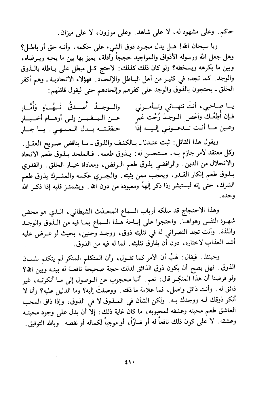 وَيَا سُبْحَانَ اللَّهِ! هَلْ يَدُلُّ مُجَرَّدُ ذَوْقِ الشَّيْءِ عَلَى حُكْمِهِ، وَأَنَّهُ حَقٌّ أَوْ بَاطِلٌ؟ وَهَلْ جَعَلَ اللَّهُ وَرَسُولُهُ الْأَذْوَاقَ وَالْمَوَاجِيدَ حُجَجًا وَأَدِلَّةً، يُمَيَّزُ بِهَا بَيْنَ مَا يُحِبُّهُ وَيَرْضَاهُ، وَبَيْنَ مَا يَكْرَهُهُ وَيَسْخَطُهُ؟ وَلَوْ كَانَ ذَلِكَ كَذَلِكَ: لَاحْتَجَّ كُلُّ مُبْطِلٍ عَلَى بَاطِلِهِ بِالذَّوْقِ وَالْوَجْدِ، كَمَا تَجِدُهُ فِي كَثِيرٍ مِنْ أَهْلِ الْبَاطِلِ وَالْإِلْحَادِ، فَهَؤُلَاءِ الِاتِّحَادِيَّةُ - وَهُمْ أَكْفَرُ الْخَلْقِ - يَحْتَجُّونَ بِالذَّوْقِ وَالْوَجْدِ عَلَى كُفْرِهِمْ وَإِلْحَادِهِمْ حَتَّى لَيَقُولُ قَائِلُهُمْ: