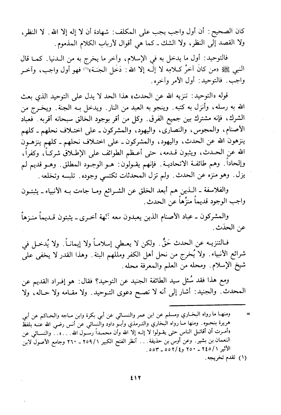 كَانَ الصَّحِيحُ: أَنَّ أَوَّلَ وَاجِبٍ يَجِبُ عَلَى الْمُكَلَّفِ: شَهَادَةُ أَنْ لَا إِلَهَ إِلَّا اللَّهُ، لَا النَّظَرُ، وَلَا الْقَصْدُ إِلَى النَّظَرِ، وَلَا الشَّكُّ - كَمَا هِيَ أَقْوَالٌ لِأَرْبَابِ الْكَلَامِ الْمَذْمُومِ.