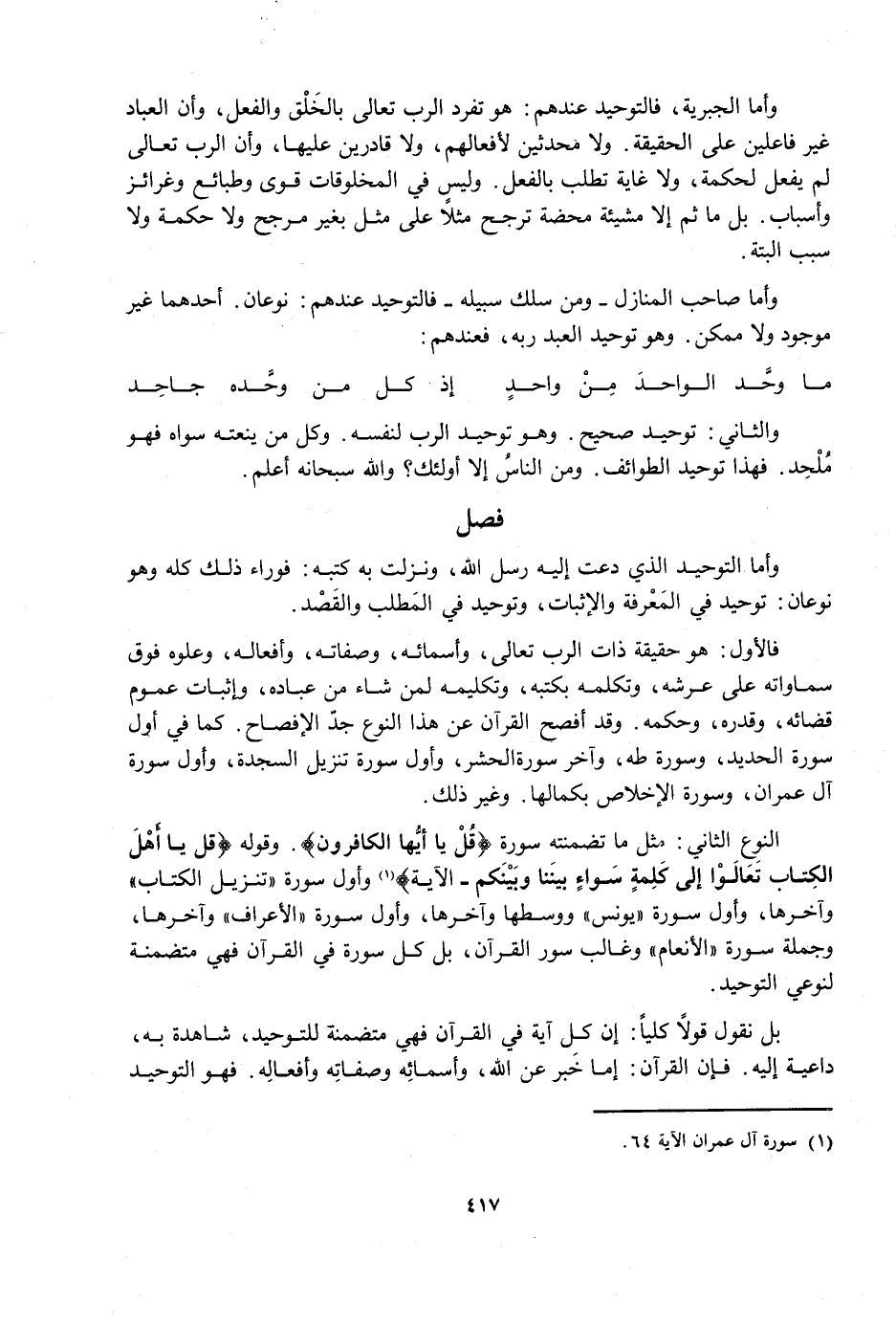 النَّوْعُ الثَّانِي: مِثْلُ مَا تَضَمَّنَتْهُ سُورَةُ {قُلْ يَاأَيُّهَا الْكَافِرُونَ} [الكافرون: 1] وَقَوْلِهِ: {قُلْ يَاأَهْلَ الْكِتَابِ تَعَالَوْا إِلَى كَلِمَةٍ سَوَاءٍ بَيْنَنَا وَبَيْنَكُمْ} [آل عمران: 64]- الْآيَةَ وَأَوَّلِ سُورَةِ " تَنْزِيلُ الْكِتَابِ " وَآخِرِهَا، وَأَوَّلِ سُورَةِ يُونُسَ وَوَسَطِهَا وَآخِرِهَا، وَأَوَّلِ سُورَةِ الْأَعْرَافِ وَآخِرِهَا، وَجُمْلَةِ سُورَةِ الْأَنْعَامِ وَغَالِبِ سُوَرِ الْقُرْآنِ، بَلْ كُلُّ سُورَةٍ فِي الْقُرْآنِ فَهِيَ مُتَضَمِّنَةٌ لِنَوْعَيِ التَّوْحِيدِ.