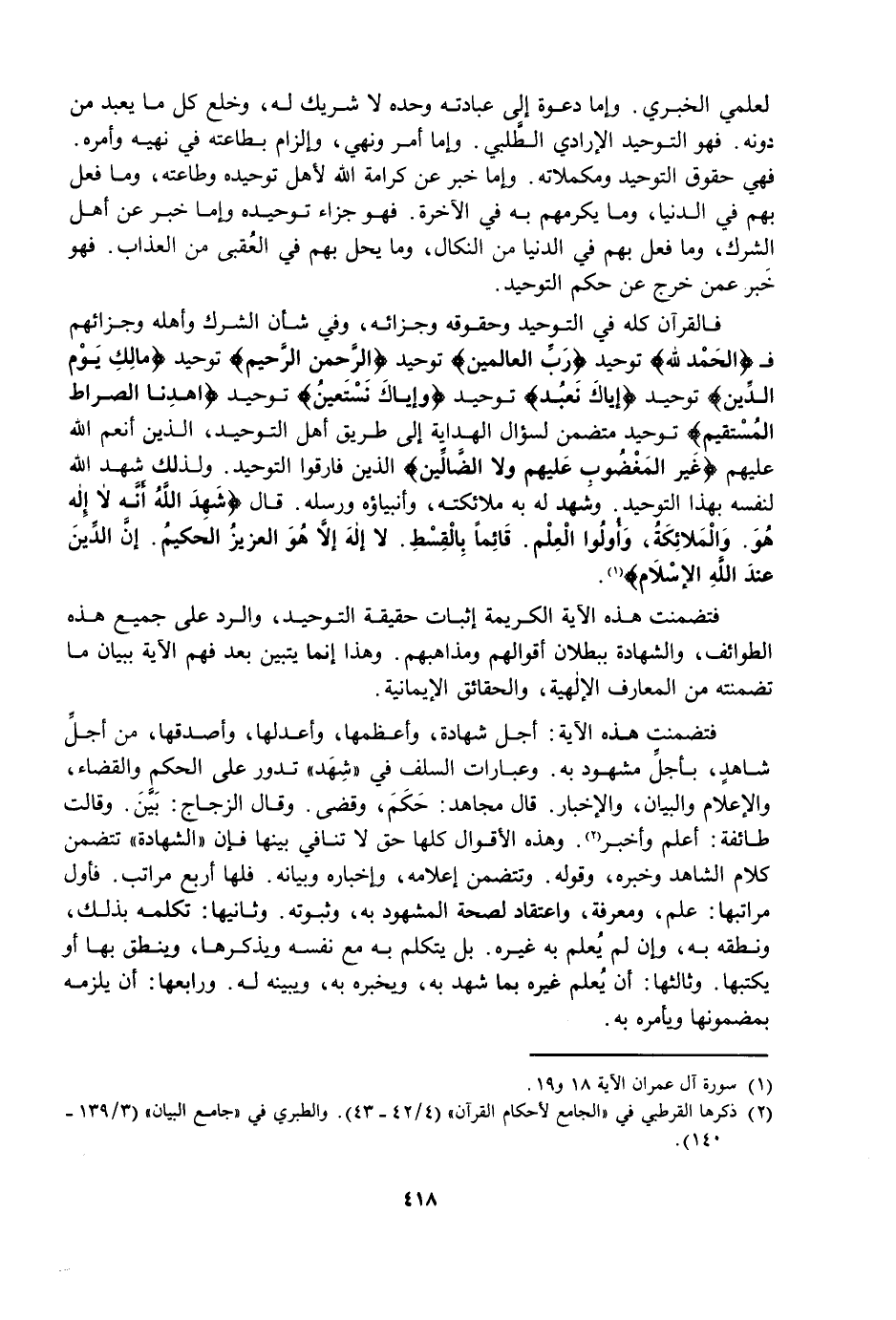 فَالْقُرْآنُ كُلُّهُ فِي التَّوْحِيدِ وَحُقُوقِهِ وَجَزَائِهِ، وَفِي شَأْنِ الشِّرْكِ وَأَهْلِهِ وَجَزَائِهِمْ فَ {الْحَمْدُ لِلَّهِ} [الفاتحة: 2] تَوْحِيدٌ {رَبِّ الْعَالَمِينَ} [الفاتحة: 2] تَوْحِيدٌ {الرَّحْمَنِ الرَّحِيمِ} [الفاتحة: 3] تَوْحِيدٌ {مَالِكِ يَوْمِ الدِّينِ} [الفاتحة: 4] تَوْحِيدٌ {إِيَّاكَ نَعْبُدُ} [الفاتحة: 5] تَوْحِيدٌ {وَإِيَّاكَ نَسْتَعِينُ} [الفاتحة: 5] تَوْحِيدٌ {اهْدِنَا الصِّرَاطَ الْمُسْتَقِيمَ} [الفاتحة: 6] تَوْحِيدٌ مُتَضَمِّنٌ لِسُؤَالِ الْهِدَايَةِ إِلَى طَرِيقِ أَهْلِ التَّوْحِيدِ، الَّذِينَ أَنْعَمَ اللَّهُ عَلَيْهِمْ {غَيْرِ الْمَغْضُوبِ عَلَيْهِمْ وَلَا الضَّالِّينَ} [الفاتحة: 7] الَّذِينَ فَارَقُوا التَّوْحِيدَ، وَلِذَلِكَ شَهِدَ اللَّهُ لِنَفْسِهِ بِهَذَا التَّوْحِيدِ، وَشَهِدَ لَهُ بِهِ مَلَائِكَتُهُ، وَأَنْبِيَاؤُهُ وَرُسُلُهُ، قَالَ: {شَهِدَ اللَّهُ أَنَّهُ لَا إِلَهَ إِلَّا هُوَ وَالْمَلَائِكَةُ وَأُولُو الْعِلْمِ قَائِمًا بِالْقِسْطِ لَا إِلَهَ إِلَّا هُوَ الْعَزِيزُ الْحَكِيمُ إِنَّ الدِّينَ عِنْدَ اللَّهِ الْإِسْلَامُ} [آل عمران: 18] .