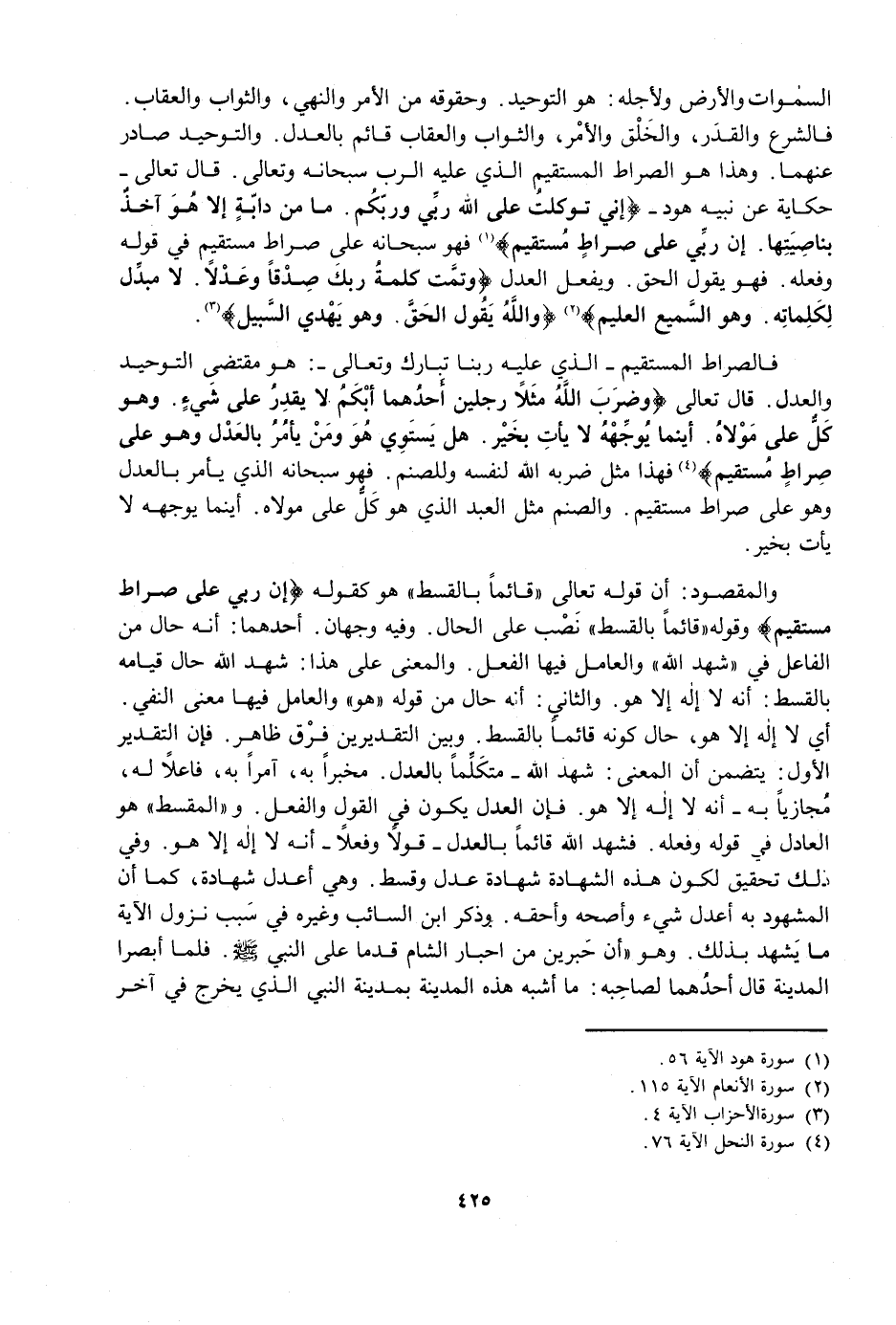 فَالصِّرَاطُ الْمُسْتَقِيمُ - الَّذِي عَلَيْهِ رَبُّنَا تَبَارَكَ وَتَعَالَى -: هُوَ مُقْتَضَى التَّوْحِيدِ وَالْعَدْلِ، قَالَ تَعَالَى: {وَضَرَبَ اللَّهُ مَثَلًا رَجُلَيْنِ أَحَدُهُمَا أَبْكَمُ لَا يَقْدِرُ عَلَى شَيْءٍ وَهُوَ كَلٌّ عَلَى مَوْلَاهُ أَيْنَمَا يُوَجِّهْهُ لَا يَأْتِ بِخَيْرٍ هَلْ يَسْتَوِي هُوَ وَمَنْ يَأْمُرُ بِالْعَدْلِ وَهُوَ عَلَى صِرَاطٍ مُسْتَقِيمٍ} [النحل: 76] فَهَذَا مَثَلٌ ضَرَبَهُ اللَّهُ لِنَفْسِهِ وَلِلصَّنَمِ، فَهُوَ سُبْحَانَهُ الَّذِي يَأْمُرُ بِالْعَدْلِ، وَهُوَ عَلَى صِرَاطٍ مُسْتَقِيمٍ، وَالصَّنَمُ مَثَلُ الْعَبْدِ الَّذِي هُوَ كَلٌّ عَلَى مَوْلَاهُ، أَيْنَمَا يُوَجِّهْهُ لَا يَأْتِ بِخَيْرٍ.