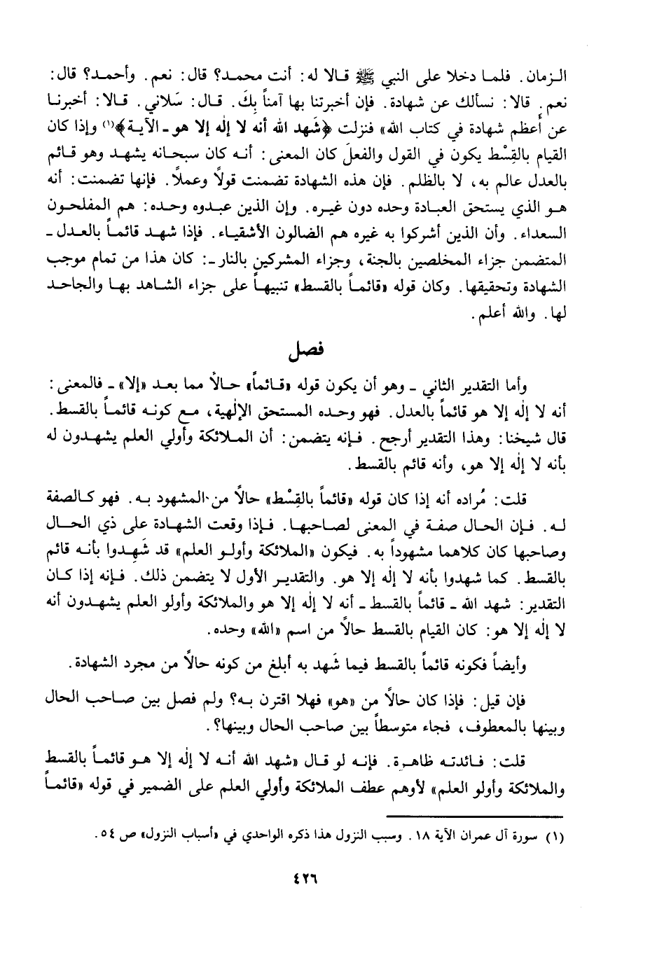 الزَّمَانِ، فَلَمَّا دَخَلَا عَلَى النَّبِيِّ - صَلَّى اللَّهُ عَلَيْهِ وَسَلَّمَ - قَالَا لَهُ: أَنْتَ مُحَمَّدٌ؟ قَالَ: نَعَمْ، وَأَحْمَدُ؟ قَالَ: نَعَمْ، قَالَا: نَسْأَلُكَ عَنْ شَهَادَةٍ، فَإِنْ أَخْبَرَتْنَا بِهَا آمَنَّا بِكَ، قَالَ: سَلَانِي، قَالَا: أَخْبِرْنَا عَنْ أَعْظَمِ شَهَادَةٍ فِي كِتَابِ اللَّهِ فَنَزَلَتْ: {شَهِدَ اللَّهُ أَنَّهُ لَا إِلَهَ إِلَّا هُوَ} [آل عمران: 18]- الْآيَةَ» وَإِذَا كَانَ الْقِيَامُ بِالْقِسْطِ يَكُونُ فِي الْقَوْلِ وَالْفِعْلِ كَانَ الْمَعْنَى: أَنَّهُ كَانَ سُبْحَانَهُ يَشْهَدُ وَهُوَ قَائِمٌ بِالْعَدْلِ عَالِمٌ بِهِ، لَا بِالظُّلْمِ، فَإِنَّ هَذِهِ الشَّهَادَةَ تَضَمَّنَتْ قَوْلًا وَعَمَلًا، فَإِنَّهَا تَضَمَّنَتْ: أَنَّهُ هُوَ الَّذِي يَسْتَحِقُّ الْعِبَادَةَ وَحْدَهُ دُونَ غَيْرِهِ، وَأَنَّ الَّذِينَ عَبَدُوهُ وَحْدَهُ: هُمُ الْمُفْلِحُونَ السُّعَدَاءُ، وَأَنَّ الَّذِينَ أَشْرَكُوا بِهِ غَيْرَهُ هُمُ الضَّالُّونَ الْأَشْقِيَاءُ، فَإِذَا شَهِدَ قَائِمًا بِالْعَدْلِ - الْمُتَضَمِّنِ جَزَاءَ الْمُخْلِصِينَ بِالْجَنَّةِ، وَجَزَاءَ الْمُشْرِكِينَ بِالنَّارِ -: كَانَ هَذَا مِنْ تَمَامِ مُوجَبِ الشَّهَادَةِ وَتَحْقِيقِهَا، وَكَانَ قَوْلُهُ {قَائِمًا بِالْقِسْطِ} [آل عمران: 18] تَنْبِيهًا عَلَى جَزَاءِ الشَّاهِدِ بِهَا وَالْجَاحِدِ لَهَا، وَاللَّهُ أَعْلَمُ.