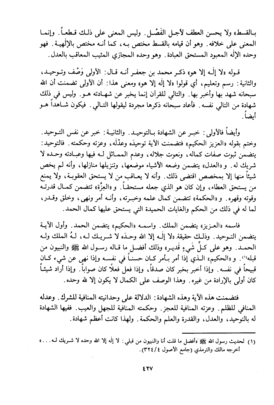 فَتَضَمَّنَتْ هَذِهِ الْآيَةُ وَهَذِهِ الشَّهَادَةُ: الدَّلَالَةَ عَلَى وَحْدَانِيَّتِهِ الْمُنَافِيَةِ لِلشِّرْكِ، وَعَدْلِهُ الْمُنَافِي لِلظُّلْمِ، وَعِزَّتِهِ الْمُنَافِيَةِ لِلْعَجْزِ، وَحِكْمَتِهِ الْمُنَافِيَةِ لِلْجَهْلِ وَالْعَيْبِ، فَفِيهَا الشَّهَادَةُ لَهُ بِالتَّوْحِيدِ، وَالْعَدْلِ، وَالْقُدْرَةِ وَالْعِلْمِ وَالْحِكْمَةِ، وَلِهَذَا كَانَتْ أَعْظَمَ شَهَادَةٍ.