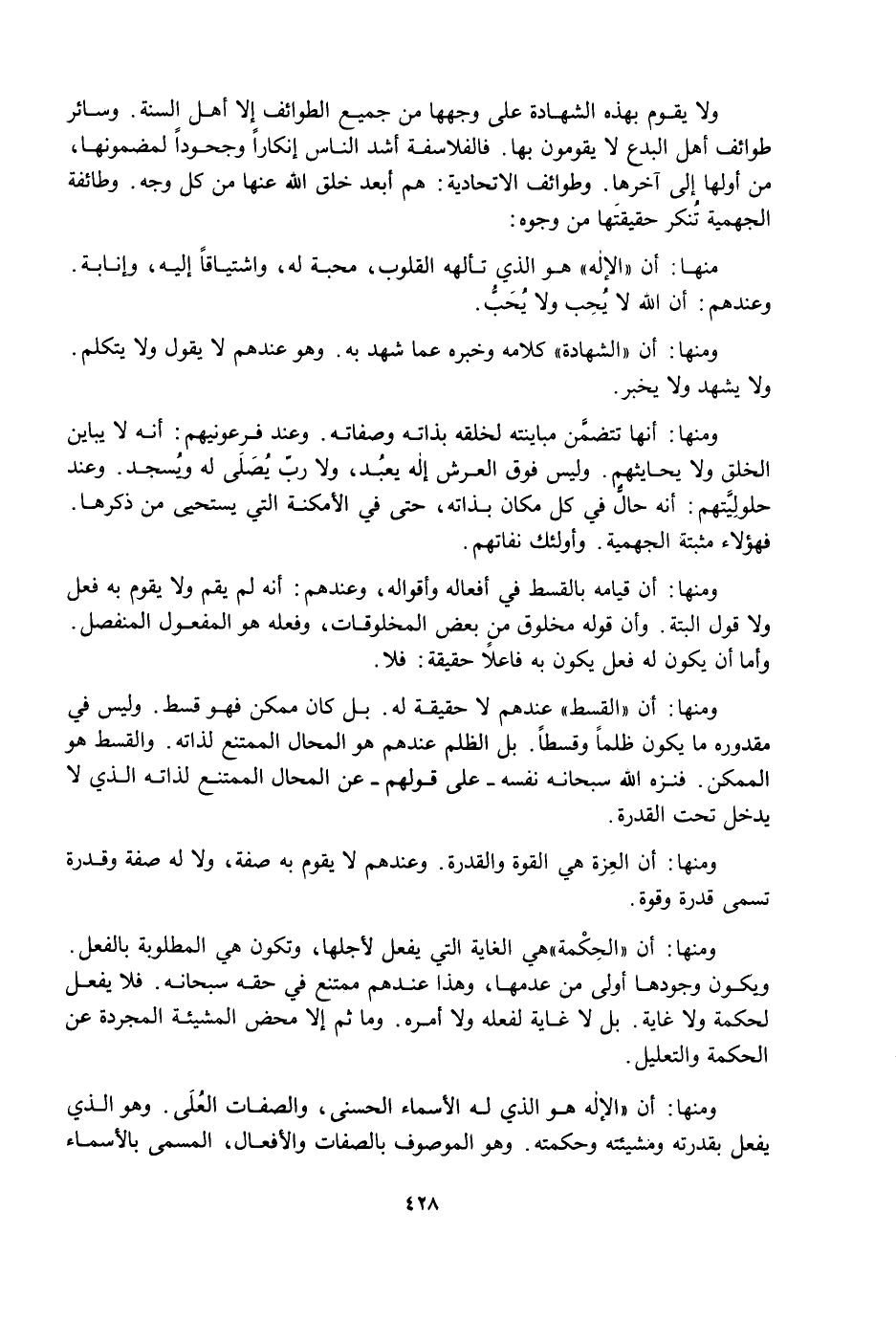 وَلَا يَقُومُ لِهَذِهِ الشَّهَادَةِ عَلَى وَجْهِهَا مِنْ جَمِيعِ الطَّوَائِفِ إِلَّا أَهْلُ السُّنَّةِ، وَسَائِرُ طَوَائِفِ أَهْلِ الْبِدَعِ لَا يَقُومُونَ بِهَا، فَالْفَلَاسِفَةُ أَشَدُّ النَّاسِ إِنْكَارًا وَجُحُودًا لِمَضْمُونِهَا، مِنْ أَوَّلِهَا إِلَى آخِرِهَا، وَطَوَائِفُ الِاتِّحَادِيَّةِ: هُمْ أَبْعَدُ خَلْقِ اللَّهِ عَنْهَا مِنْ كُلِّ وَجْهٍ، وَطَائِفَةُ الْجَهْمِيَّةِ تُنْكِرُ حَقِيقَتَهَا مِنْ وُجُوهٍ: