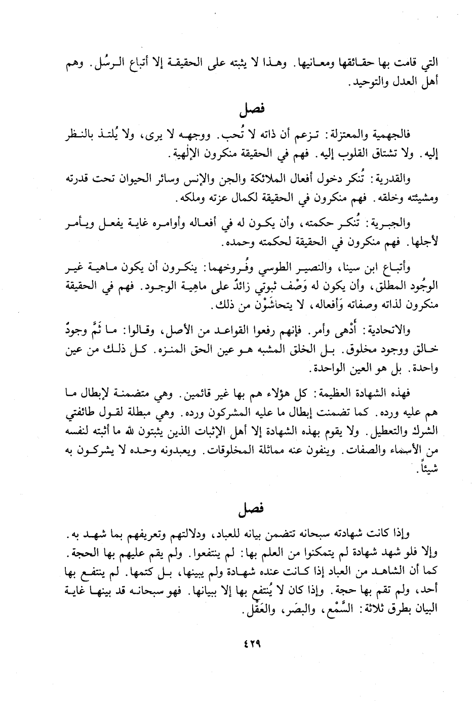 وَأَتْبَاعُ ابْنِ سِينَا، وَالنَّصِيرِ الطُّوسِيِّ وَفُرُوخِهِمَا: يُنْكِرُونَ أَنْ يَكُونَ مَاهِيَّةٌ غَيْرَ الْوُجُودِ الْمُطْلَقِ، وَأَنْ يَكُونَ لَهُ وَصْفٌ ثُبُوتِيٌّ زَائِدٌ عَلَى مَاهِيَّةِ الْوُجُودِ، فَهُمْ فِي الْحَقِيقَةِ مُنْكِرُونَ لِذَاتِهِ وَصِفَاتِهِ وَأَفْعَالِهِ، لَا يَتَحَاشَوْنَ مِنْ ذَلِكَ.