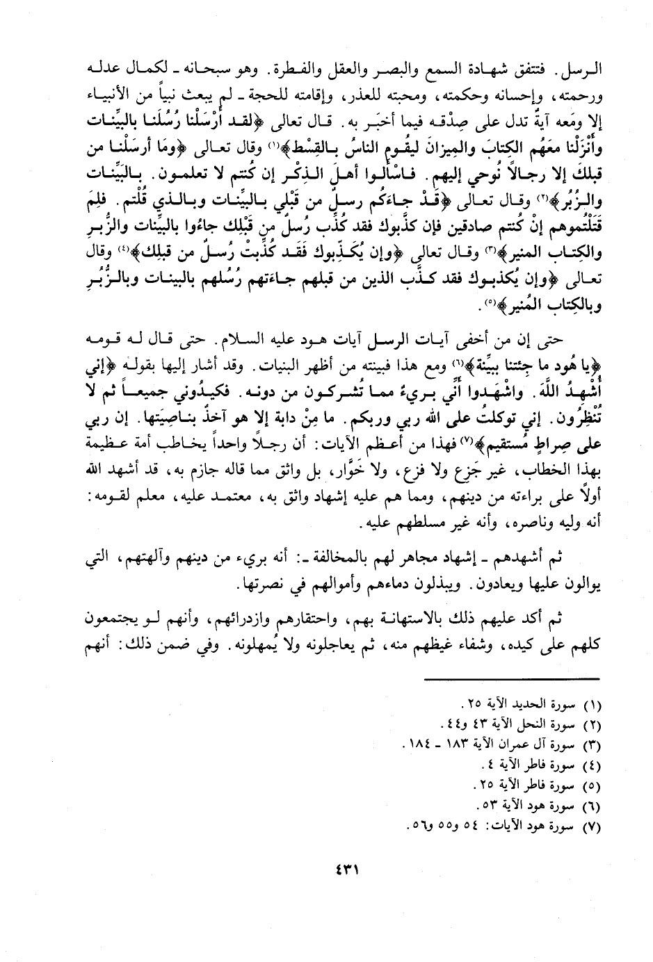 الرُّسُلُ، فَتَتَّفِقُ شَهَادَةُ السَّمْعِ وَالْبَصَرِ وَالْعَقْلِ وَالْفِطْرَةِ، وَهُوَ سُبْحَانَهُ - لِكَمَالِ عَدْلِهِ وَرَحْمَتِهِ، وَإِحْسَانِهِ وَحِكْمَتِهِ، وَمَحَبَّتِهِ لِلْعُذْرِ، وَإِقَامَتِهِ لِلْحُجَّةِ - لَمْ يَبْعَثْ نَبِيًّا مِنَ الْأَنْبِيَاءِ إِلَّا وَمَعَهُ آيَةٌ تَدُلُّ عَلَى صِدْقِهِ فِيمَا أَخْبَرَ بِهِ، قَالَ تَعَالَى: {لَقَدْ أَرْسَلْنَا رُسُلَنَا بِالْبَيِّنَاتِ وَأَنْزَلْنَا مَعَهُمُ الْكِتَابَ وَالْمِيزَانَ لِيَقُومَ النَّاسُ بِالْقِسْطِ} [الحديد: 25] وَقَالَ تَعَالَى: {وَمَا أَرْسَلْنَا مِنْ قَبْلِكَ إِلَّا رِجَالًا نُوحِي إِلَيْهِمْ فَاسْأَلُوا أَهْلَ الذِّكْرِ إِنْ كُنْتُمْ لَا تَعْلَمُونَ بِالْبَيِّنَاتِ وَالزُّبُرِ} [النحل: 43] وَقَالَ تَعَالَى: {قَدْ جَاءَكُمْ رُسُلٌ مِنْ قَبْلِي بِالْبَيِّنَاتِ وَبِالَّذِي قُلْتُمْ فَلِمَ قَتَلْتُمُوهُمْ إِنْ كُنْتُمْ صَادِقِينَ فَإِنْ كَذَّبُوكَ فَقَدْ كُذِّبَ رُسُلٌ مِنْ قَبْلِكَ جَاءُوا بِالْبَيِّنَاتِ وَالزُّبُرِ وَالْكِتَابِ الْمُنِيرِ} [آل عمران: 183] وَقَالَ تَعَالَى: {وَإِنْ يُكَذِّبُوكَ فَقَدْ كُذِّبَتْ رُسُلٌ مِنْ قَبْلِكَ} [فاطر: 4] وَقَالَ تَعَالَى: {وَإِنْ يُكَذِّبُوكَ فَقَدْ كَذَّبَ الَّذِينَ مِنْ قَبْلِهِمْ جَاءَتْهُمْ رُسُلُهُمْ بِالْبَيِّنَاتِ وَبِالزُّبُرِ وَبِالْكِتَابِ الْمُنِيرِ} [فاطر: 25] .