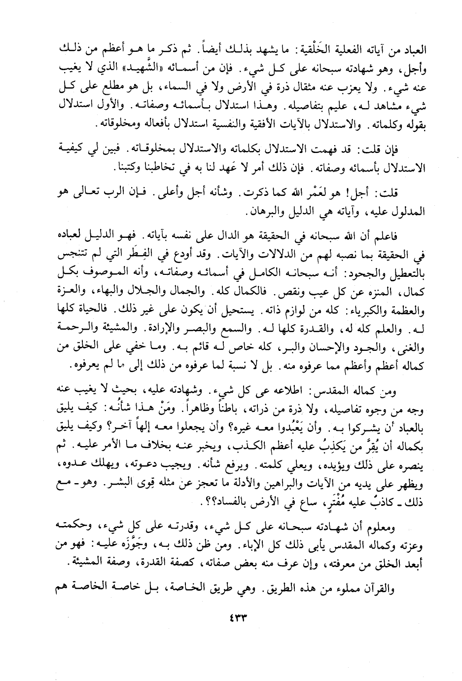 فَاعْلَمْ أَنَّ اللَّهَ سُبْحَانَهُ فِي الْحَقِيقَةِ هُوَ الدَّالُّ عَلَى نَفْسِهِ بِآيَاتِهِ، فَهُوَ الدَّلِيلُ لِعِبَادِهِ فِي الْحَقِيقَةِ بِمَا نَصَبَهُ لَهُمْ مِنَ الدَّلَالَاتِ وَالْآيَاتِ، وَقَدْ أَوْدَعَ فِي الْفِطَرِ الَّتِي لَمْ تَتَنَجَّسْ بِالتَّعْطِيلِ وَالْجُحُودِ: أَنَّهُ سُبْحَانَهُ الْكَامِلُ فِي أَسْمَائِهِ وَصِفَاتِهِ، وَأَنَّهُ الْمَوْصُوفُ بِكُلِّ كَمَالٍ، الْمُنَزَّهُ عَنْ كُلِّ عَيْبٍ وَنَقْصٍ، فَالْكَمَالُ كُلُّهُ، وَالْجَمَالُ وَالْجَلَالُ وَالْبَهَاءُ، وَالْعِزَّةُ وَالْعَظَمَةُ وَالْكِبْرِيَاءُ: كُلُّهُ مِنْ لَوَازِمِ ذَاتِهِ، يَسْتَحِيلُ أَنْ يَكُونَ عَلَى غَيْرِ ذَلِكَ، فَالْحَيَاةُ كُلُّهَا لَهُ، وَالْعِلْمُ كُلُّهُ لَهُ، وَالْقُدْرَةُ كُلُّهَا لَهُ، وَالسَّمْعُ وَالْبَصَرُ وَالْإِرَادَةُ، وَالْمَشِيئَةُ وَالرَّحْمَةُ وَالْغِنَى، وَالْجُودُ وَالْإِحْسَانُ وَالْبِرُّ، كُلُّهُ خَاصُّ لَهُ قَائِمٌ بِهِ، وَمَا خَفِيَ عَلَى الْخَلْقِ مِنْ كَمَالِهِ أَعْظَمُ وَأَعْظَمُ مِمَّا عَرَفُوهُ مِنْهُ، بَلْ لَا نِسْبَةَ لِمَا عَرَفُوهُ مِنْ ذَلِكَ إِلَى مَا لَمْ يَعْرِفُوهُ.