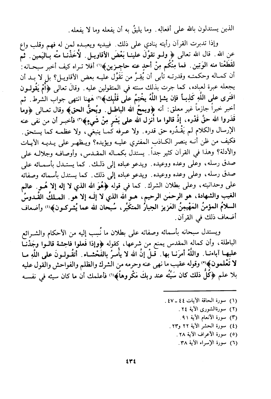 وَإِذَا تَدَبَّرْتَ الْقُرْآنَ رَأَيْتَهُ يُنَادِي عَلَى ذَلِكَ، فَيُبْدِيهِ وَيُعِيدُهُ لِمَنْ لَهُ فَهْمٌ وَقَلْبٌ وَاعٍ عَنِ اللَّهِ، قَالَ اللَّهُ تَعَالَى: {وَلَوْ تَقَوَّلَ عَلَيْنَا بَعْضَ الْأَقَاوِيلِ لَأَخَذْنَا مِنْهُ بِالْيَمِينِ ثُمَّ لَقَطَعْنَا مِنْهُ الْوَتِينَ فَمَا مِنْكُمْ مِنْ أَحَدٍ عَنْهُ حَاجِزِينَ} [الحاقة: 44] أَفَلَا تَرَاهُ كَيْفَ يُخْبِرُ سُبْحَانَهُ: أَنَّ كَمَالَهُ وَحِكْمَتَهُ وَقُدْرَتَهُ تَأْبَى أَنْ يُقِرَّ مَنْ تَقَوَّلَ عَلَيْهِ بَعْضَ الْأَقَاوِيلِ؟ بَلْ لَابُدَّ أَنْ يَجْعَلَهُ عِبْرَةً لِعِبَادِهِ، كَمَا جَرَتْ بِذَلِكَ سُنَّتُهُ فِي الْمُتَقَوِّلِينَ عَلَيْهِ، وَقَالَ تَعَالَى: {أَمْ يَقُولُونَ افْتَرَى عَلَى اللَّهِ كَذِبًا فَإِنْ يَشَأِ اللَّهُ يَخْتِمْ عَلَى قَلْبِكَ} [الشورى: 24] هَاهُنَا انْتَهَى جَوَابُ الشَّرْطِ، ثُمَّ أَخْبَرَ خَبَرًا جَازِمًا غَيْرَ مُعَلَّقٍ: أَنَّهُ {يَمْحُ اللَّهُ الْبَاطِلَ وَيُحِقُّ الْحَقَّ} [الشورى: 24] وَقَالَ تَعَالَى: {وَمَا قَدَرُوا اللَّهَ حَقَّ قَدْرِهِ إِذْ قَالُوا مَا أَنْزَلَ اللَّهُ عَلَى بَشَرٍ مِنْ شَيْءٍ} [الأنعام: 91] فَأَخْبَرَ أَنَّ مَنْ نَفَى عَنْهُ الْإِرْسَالَ وَالْكَلَامَ لَمْ يُقَدِّرْهُ حَقَّ قَدْرِهِ، وَلَا عَرَفَهُ كَمَا يَنْبَغِي، وَلَا عَظَّمَهُ كَمَا يَسْتَحِقُّ، فَكَيْفَ مَنْ ظَنَّ أَنَّهُ يَنْصُرُ الْكَاذِبَ الْمُفْتَرِيَ عَلَيْهِ وَيُؤَيِّدُهُ؟ وَيُظْهِرُ عَلَى يَدَيْهِ الْآيَاتِ وَالْأَدِلَّةَ؟ وَهَذَا فِي الْقُرْآنِ كَثِيرٌ جِدًّا، يُسْتَدَلُّ بِكَمَالِهِ الْمُقَدَّسِ، وَأَوْصَافِهِ وَجَلَالِهِ عَلَى صِدْقِ رُسُلِهِ، وَعَلَى وَعْدِهِ وَوَعِيدِهِ، وَيَدْعُو عِبَادَهُ إِلَى ذَلِكَ، كَمَا يُسْتَدَلُّ بِأَسْمَائِهِ وَصِفَاتِهِ عَلَى وَحْدَانِيَّتِهِ، وَعَلَى بُطْلَانِ الشِّرْكِ، كَمَا فِي قَوْلِهِ: {هُوَ اللَّهُ الَّذِي لَا إِلَهَ إِلَّا هُوَ عَالِمُ الْغَيْبِ وَالشَّهَادَةِ هُوَ الرَّحْمَنُ الرَّحِيمُ - هُوَ اللَّهُ الَّذِي لَا إِلَهَ إِلَّا هُوَ الْمَلِكُ الْقُدُّوسُ السَّلَامُ الْمُؤْمِنُ الْمُهَيْمِنُ الْعَزِيزُ الْجَبَّارُ الْمُتَكَبِّرُ سُبْحَانَ اللَّهِ عَمَّا يُشْرِكُونَ} [الحشر: 22 - 23] ، وَأَضْعَافُ أَضْعَافِ ذَلِكَ فِي الْقُرْآنِ.