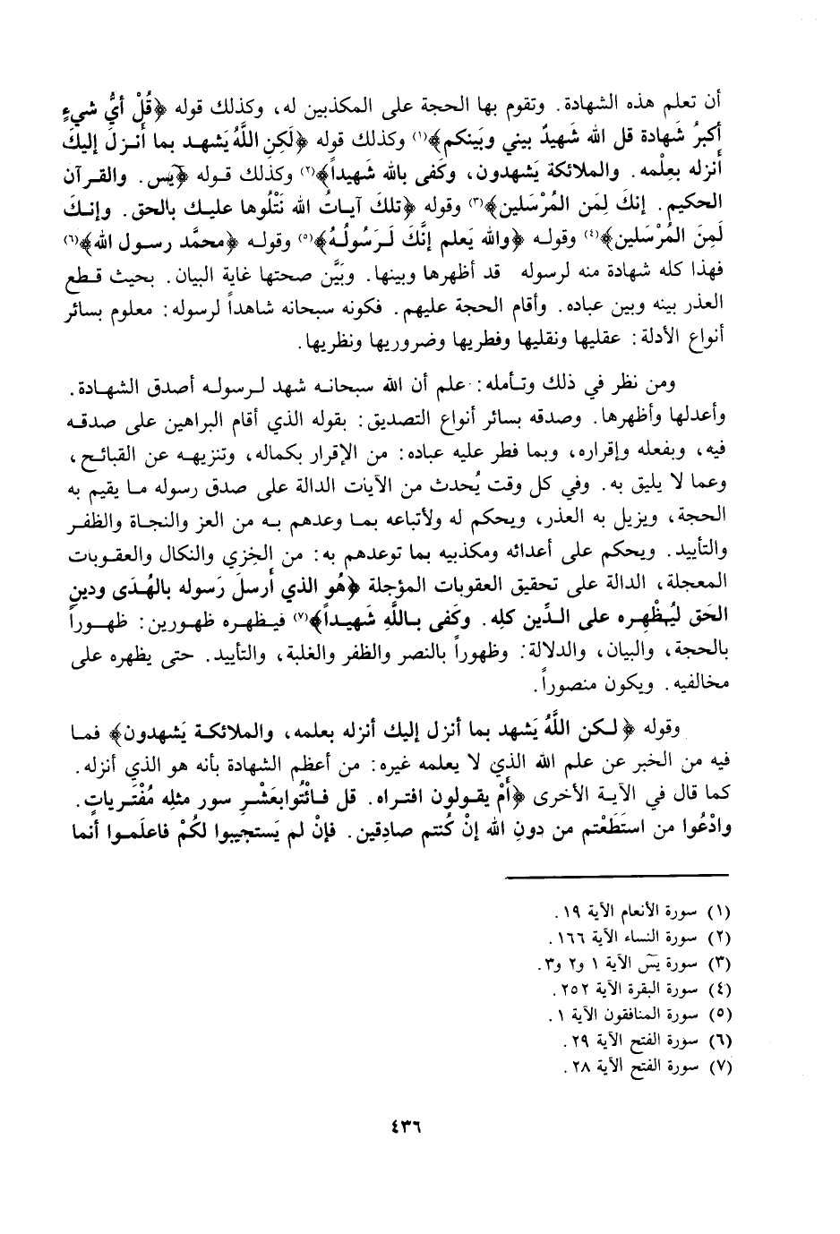 أَنَّ تُعْلَمَ هَذِهِ الشَّهَادَةُ، وَتَقُومَ بِهَا الْحُجَّةُ عَلَى الْمُكَذِّبِينَ لَهُ، وَكَذَلِكَ قَوْلُهُ {قُلْ أَيُّ شَيْءٍ أَكْبَرُ شَهَادَةً قُلِ اللَّهُ شَهِيدٌ بَيْنِي وَبَيْنَكُمْ} [الأنعام: 19] وَكَذَلِكَ قَوْلُهُ: {لَكِنِ اللَّهُ يَشْهَدُ بِمَا أَنْزَلَ إِلَيْكَ أَنْزَلَهُ بِعِلْمِهِ وَالْمَلَائِكَةُ يَشْهَدُونَ وَكَفَى بِاللَّهِ شَهِيدًا} [النساء: 166] وَكَذَلِكَ قَوْلُهُ: {يس - وَالْقُرْآنِ الْحَكِيمِ - إِنَّكَ لَمِنَ الْمُرْسَلِينَ} [يس: 1 - 3] وَقَوْلُهُ: {تِلْكَ آيَاتُ اللَّهِ نَتْلُوهَا عَلَيْكَ بِالْحَقِّ وَإِنَّكَ لَمِنَ الْمُرْسَلِينَ} [البقرة: 252] وَقَوْلُهُ: {وَاللَّهُ يَعْلَمُ إِنَّكَ لَرَسُولُهُ} [المنافقون: 1] وَقَوْلُهُ: {مُحَمَّدٌ رَسُولُ اللَّهِ} [الفتح: 29] فَهَذَا كُلُّهُ شَهَادَةٌ مِنْهُ لِرَسُولِهِ، قَدْ أَظْهَرَهَا وَبَيَّنَهَا، وَبَيَّنَ صِحَّتَهَا غَايَةَ الْبَيَانِ، بِحَيْثُ قَطَعَ الْعُذْرَ بَيْنَهُ وَبَيْنَ عِبَادِهِ، وَأَقَامَ الْحُجَّةَ عَلَيْهِمْ، فَكَوْنُهُ سُبْحَانَهُ شَاهِدًا لِرَسُولِهِ: مَعْلُومٌ بِسَائِرِ أَنْوَاعِ الْأَدِلَّةِ: عَقْلِيِّهَا وَنَقْلِيِّهَا وَفِطْرِيِّهَا وَضَرُورِيِّهَا وَنَظَرِيِّهَا.