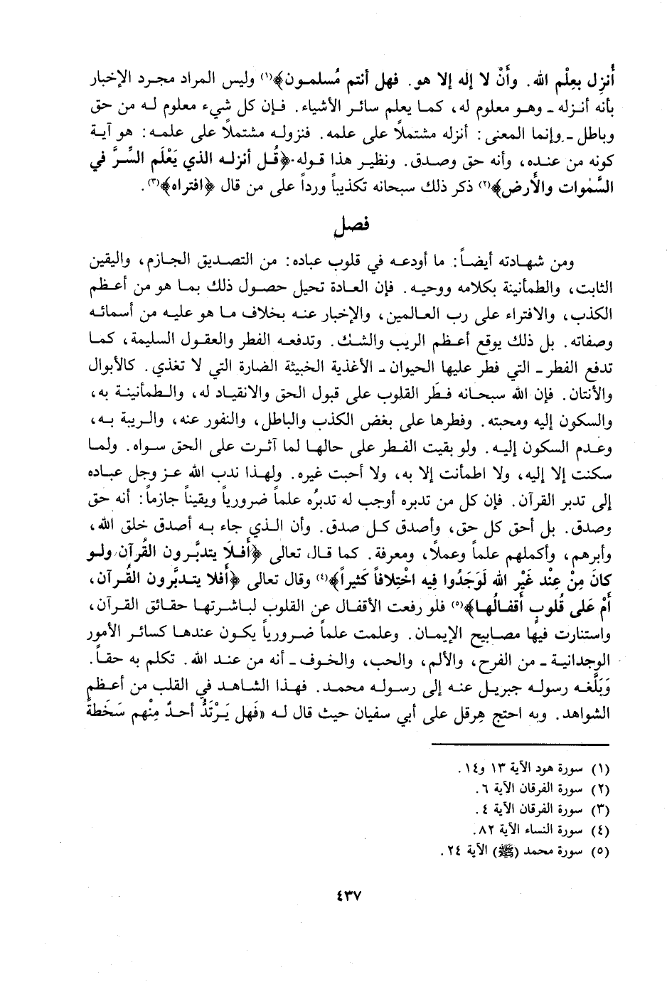 وَمِنْ شَهَادَتِهِ أَيْضًا: مَا أَوْدَعَهُ فِي قُلُوبِ عِبَادِهِ: مِنَ التَّصْدِيقِ الْجَازِمِ، وَالْيَقِينِ الثَّابِتِ، وَالطُّمَأْنِينَةِ بِكَلَامِهِ وَوَحْيِهِ، فَإِنَّ الْعَادَةَ تُحِيلُ حُصُولَ ذَلِكَ بِمَا هُوَ مِنْ أَعْظَمِ الْكَذِبِ، وَالِافْتِرَاءِ عَلَى رَبِّ الْعَالَمِينَ، وَالْإِخْبَارِ عَنْهُ بِخِلَافِ مَا هُوَ عَلَيْهِ مِنْ أَسْمَائِهِ وَصِفَاتِهِ، بَلْ ذَلِكَ يُوقِعُ أَعْظَمَ الرَّيْبِ وَالشَّكِّ، وَتَدْفَعُهُ الْفِطَرُ وَالْعُقُولُ السَّلِيمَةُ، كَمَا تَدْفَعُ الْفِطَرُ - الَّتِي فُطِرَ عَلَيْهَا الْحَيَوَانُ - الْأَغْذِيَةَ الْخَبِيثَةَ الضَّارَّةَ الَّتِي لَا تُغَذِّي، كَالْأَبْوَالِ وَالْأَنْتَانِ، فَإِنَّ اللَّهَ سُبْحَانَهُ فَطَرَ الْقُلُوبَ عَلَى قَبُولِ الْحَقِّ وَالِانْقِيَادِ لَهُ، وَالطُّمَأْنِينَةِ بِهِ، وَالسُّكُونِ إِلَيْهِ وَمَحَبَّتِهِ، وَفَطَرَهَا عَلَى بُغْضِ الْكَذِبِ وَالْبَاطِلِ، وَالنُّفُورِ عَنْهُ، وَالرِّيبَةِ بِهِ، وَعَدَمِ السُّكُونِ إِلَيْهِ، وَلَوْ بَقِيَتِ الْفِطَرُ عَلَى حَالِهَا لَمَا آثَرَتْ عَلَى الْحَقِّ سِوَاهُ، وَلَمَا سَكَنَتْ إِلَّا إِلَيْهِ، وَلَا اطْمَأَنَّتْ إِلَّا بِهِ، وَلَا أَحَبَّتْ غَيْرَهُ، وَلِهَذَا نَدَبَ اللَّهُ عَزَّ وَجَلَّ عِبَادَهُ إِلَى تَدَبُّرِ الْقُرْآنِ، فَإِنَّ كُلَّ مَنْ تَدَبَّرَهُ أَوْجَبَ لَهُ تَدَبُّرُهُ عِلْمًا ضَرُورِيًا وَيَقِينًا جَازِمًا: أَنَّهُ حَقٌّ وَصِدْقٌ، بَلْ أَحَقُّ كُلَّ الْحَقِّ، وَأَصْدَقُ كُلَّ صِدْقٍ، وَأَنَّ الَّذِي جَاءَ بِهِ أَصْدَقُ خَلْقِ اللَّهِ، وَأَبَرُّهُمْ، وَأَكْمَلُهُمْ عِلْمًا وَعَمَلًا، وَمَعْرِفَةً، كَمَا قَالَ تَعَالَى: {أَفَلَا يَتَدَبَّرُونَ الْقُرْآنَ وَلَوْ كَانَ مِنْ عِنْدِ غَيْرِ اللَّهِ لَوَجَدُوا فِيهِ اخْتِلَافًا كَثِيرًا} [النساء: 82] وَقَالَ تَعَالَى: {أَفَلَا يَتَدَبَّرُونَ الْقُرْآنَ أَمْ عَلَى قُلُوبٍ أَقْفَالُهَا} [محمد: 24] فَلَوْ رُفِعَتِ الْأَقْفَالُ عَنِ الْقُلُوبِ لَبَاشَرَتْهَا حَقَائِقُ الْقُرْآنِ، وَاسْتَنَارَتْ فِيهَا مَصَابِيحُ الْإِيمَانِ، وَعَلِمْتَ عِلْمًا ضَرُورِيًّا يَكُونُ عِنْدَهَا كَسَائِرِ الْأُمُورِ الْوِجْدَانِيَّةِ - مِنَ الْفَرَحِ، وَالْأَلَمِ، وَالْحُبِّ، وَالْخَوْفِ - أَنَّهُ مِنْ عِنْدِ اللَّهِ، تَكَلَّمَ بِهِ حَقًّا، وَبَلَّغَهُ رَسُولُهُ جِبْرِيلُ عَنْهُ إِلَى رَسُولِهِ مُحَمَّدٍ، فَهَذَا الشَّاهِدُ فِي الْقَلْبِ مِنْ أَعْظَمِ الشَّوَاهِدِ، وَبِهِ احْتَجَّ هِرَقْلُ عَلَى أَبِي سُفْيَانَ حَيْثُ قَالَ لَهُ: فَهَلْ يَرْتَدُّ أَحَدٌ مِنْهُمْ سَخْطَةً