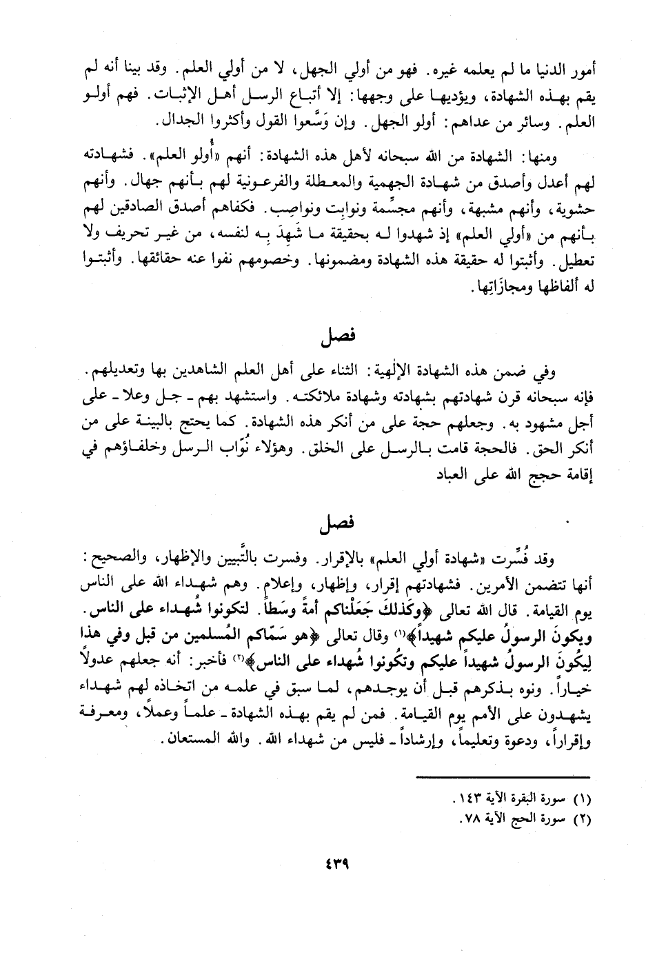 وَقَدْ فُسِّرَتْ شَهَادَةُ أُولِي الْعِلْمِ بِالْإِقْرَارِ، وَفُسِّرَتْ بِالتَّبْيِينِ وَالْإِظْهَارِ، وَالصَّحِيحُ: أَنَّهَا تَتَضَمَّنُ الْأَمْرَيْنِ، فَشَهَادَتُهُمْ إِقْرَارٌ، وَإِظْهَارٌ، وَإِعْلَامٌ، وَهُمْ شُهَدَاءُ اللَّهِ عَلَى النَّاسِ يَوْمَ الْقِيَامَةِ، قَالَ اللَّهُ تَعَالَى: {وَكَذَلِكَ جَعَلْنَاكُمْ أُمَّةً وَسَطًا لِتَكُونُوا شُهَدَاءَ عَلَى النَّاسِ وَيَكُونَ الرَّسُولُ عَلَيْكُمْ شَهِيدًا} [البقرة: 143] وَقَالَ تَعَالَى: {هُوَ سَمَّاكُمُ الْمُسْلِمِينَ مِنْ قَبْلُ وَفِي هَذَا لِيَكُونَ الرَّسُولُ شَهِيدًا عَلَيْكُمْ وَتَكُونُوا شُهَدَاءَ عَلَى النَّاسِ} [الحج: 78] فَأَخْبَرَ: أَنَّهُ جَعَلَهُمْ عُدُولًا خِيَارًا، وَنَوَّهَ بِذِكْرِهِمْ قَبْلَ أَنْ يُوجِدَهُمْ، لِمَا سَبَقَ فِي عِلْمِهِ مِنَ اتِّخَاذِهِ لَهُمْ شُهَدَاءً يَشْهَدُونَ عَلَى الْأُمَمِ يَوْمَ الْقِيَامَةِ، فَمَنْ لَمْ يَقُمْ بِهَذِهِ الشَّهَادَةِ - عِلْمًا وَعَمَلًا، وَمَعْرِفَةً وَإِقْرَارًا، وَدَعْوَةً وَتَعْلِيمًا، وَإِرْشَادًا - فَلَيْسَ مِنْ شُهَدَاءِ اللَّهِ، وَاللَّهُ الْمُسْتَعَانُ.